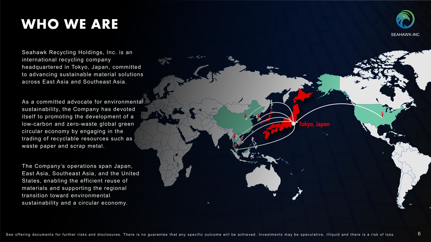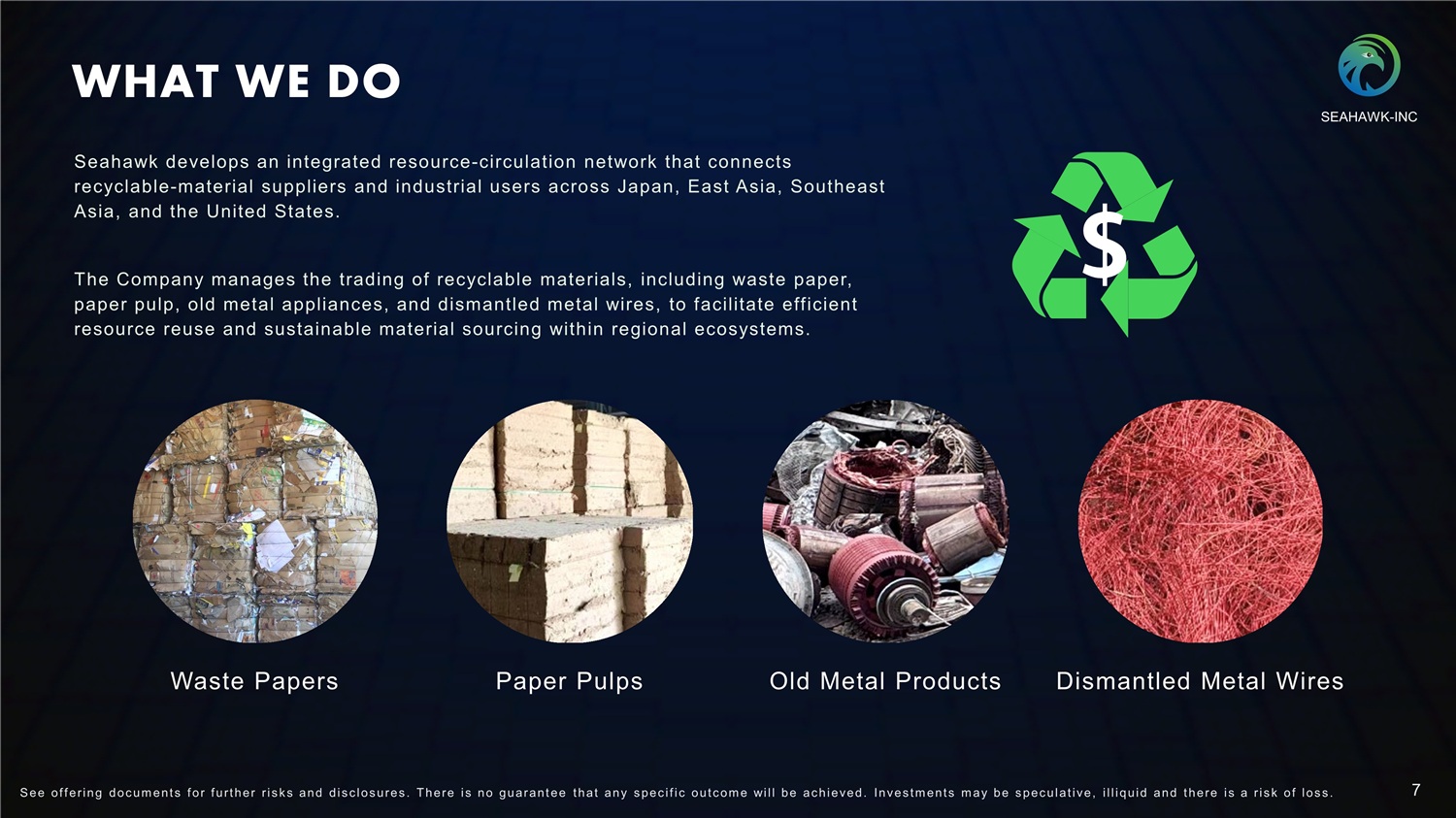 WHO WE ARE Seahawk Recycling Holdings, Inc. is an international recycling company headquartered in Tokyo, Japan, committed to advancing sustainable material solutions across East Asia and Southeast Asia. As a committed advocate for environmental sustainability, the Company has devoted itself to promoting the development of a low - carbon and zero - waste global green circular economy by engaging in the trading of recyclable resources such as waste paper and scrap metal . The Company’s operations span Japan, East Asia, Southeast Asia, and the United States, enabling the efficient reuse of materials and supporting the regional transition toward environmental sustainability and a circular economy. SEAHAWK - INC 6 S ee of f ering doc um ent s f or f urt her r i s k s and dis c los ures . There i s no guarant ee t hat any s pec i f i c out c om e will be ac hieved. Inves t m ent s m ay be s pec ulat i ve, i l l iquid and t here i s a r i s k of los s .