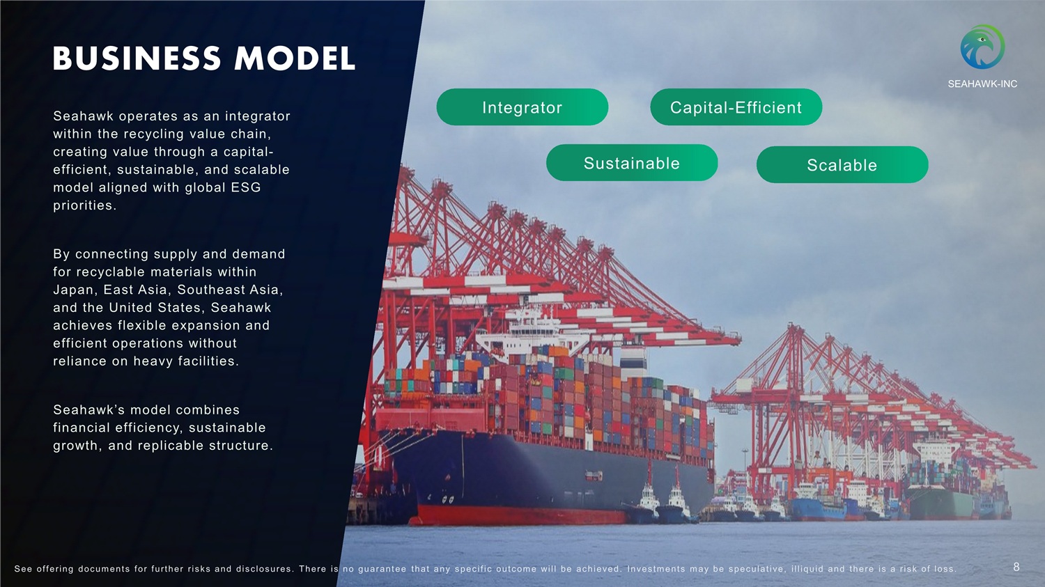 WHAT WE DO Seahawk develops an integrated resource - circulation network that connects recyclable - material suppliers and industrial users across Japan, East Asia, Southeast Asia, and the United States. The Company manages the trading of recyclable materials, including waste paper, paper pulp, old metal appliances, and dismantled metal wires, to facilitate efficient resource reuse and sustainable material sourcing within regional ecosystems. Waste Papers 7 S ee of f ering doc um ent s f or f urt her r i s k s and dis c los ures . There i s no guarant ee t hat any s pec i f i c out c om e will be ac hieved. Inves t m ent s m ay be s pec ulat i ve, i l l iquid and t here i s a r i s k of los s . Paper Pulps Old Metal Products Dismantled Metal Wires SEAHAWK - INC