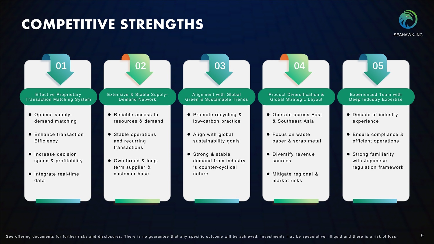 BUSINESS MODEL Seahawk operates as an integrator within the recycling value chain, creating value through a capital - efficient, sustainable, and scalable model aligned with global ESG priorities. By connecting supply and demand for recyclable materials within Japan, East Asia, Southeast Asia, and the United States, Seahawk achieves f lexible expansion and efficient operations without reliance on heavy facilities. Seahawk’s model combines f inancial efficiency, sustainable growth, and replicable structure. Integrator Capital - Efficient Sustainable Scalable SEAHAWK - INC 8 S ee of f ering doc um ent s f or f urt her r i s k s and dis c los ures . There i s no guarant ee t hat any s pec i f i c out c om e will be ac hieved. Inves t m ent s m ay be s pec ulat i ve, i l l iquid and t here i s a r i s k of los s .