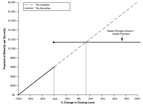 ■Payment at maturity. At maturity, if the final level is greater than or equal to the downside threshold level, investors will receive the stated principal amount plus the upside payment specified herein. If, however, the final level is less than the downside threshold level, investors will lose 1% for every 1% decline in the level of the underlier over the term of the securities. Under these circumstances, the payment at maturity will be significantly less than the stated principal amount and could be zero.