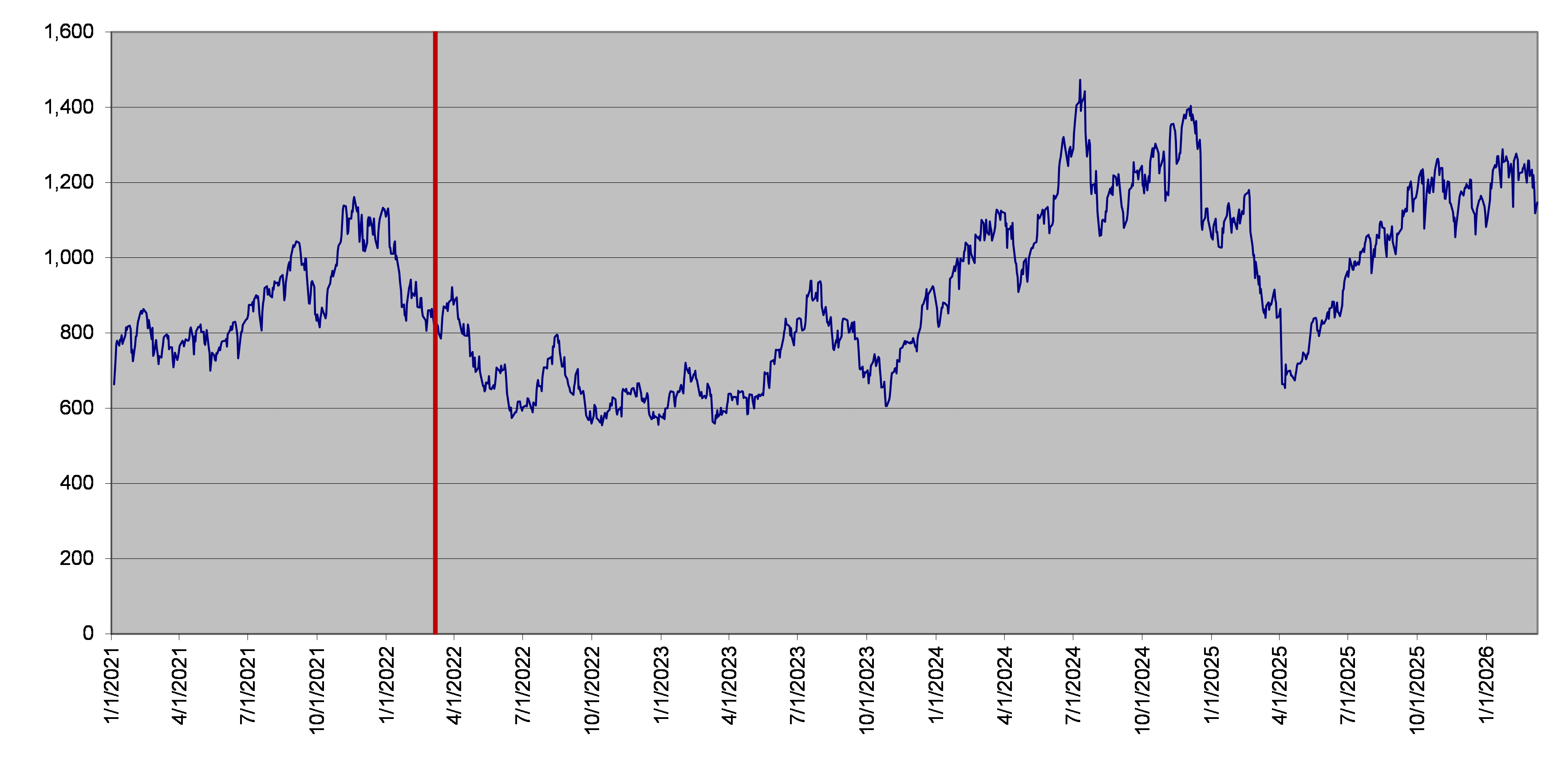 The closing level of the underlier on March 9, 2026 was 1,147.47. The following graph sets forth the hypothetical retrospective and daily closing levels of the underlier for the period noted below. No assurance can be given as to the closing level of the underlier at any time.