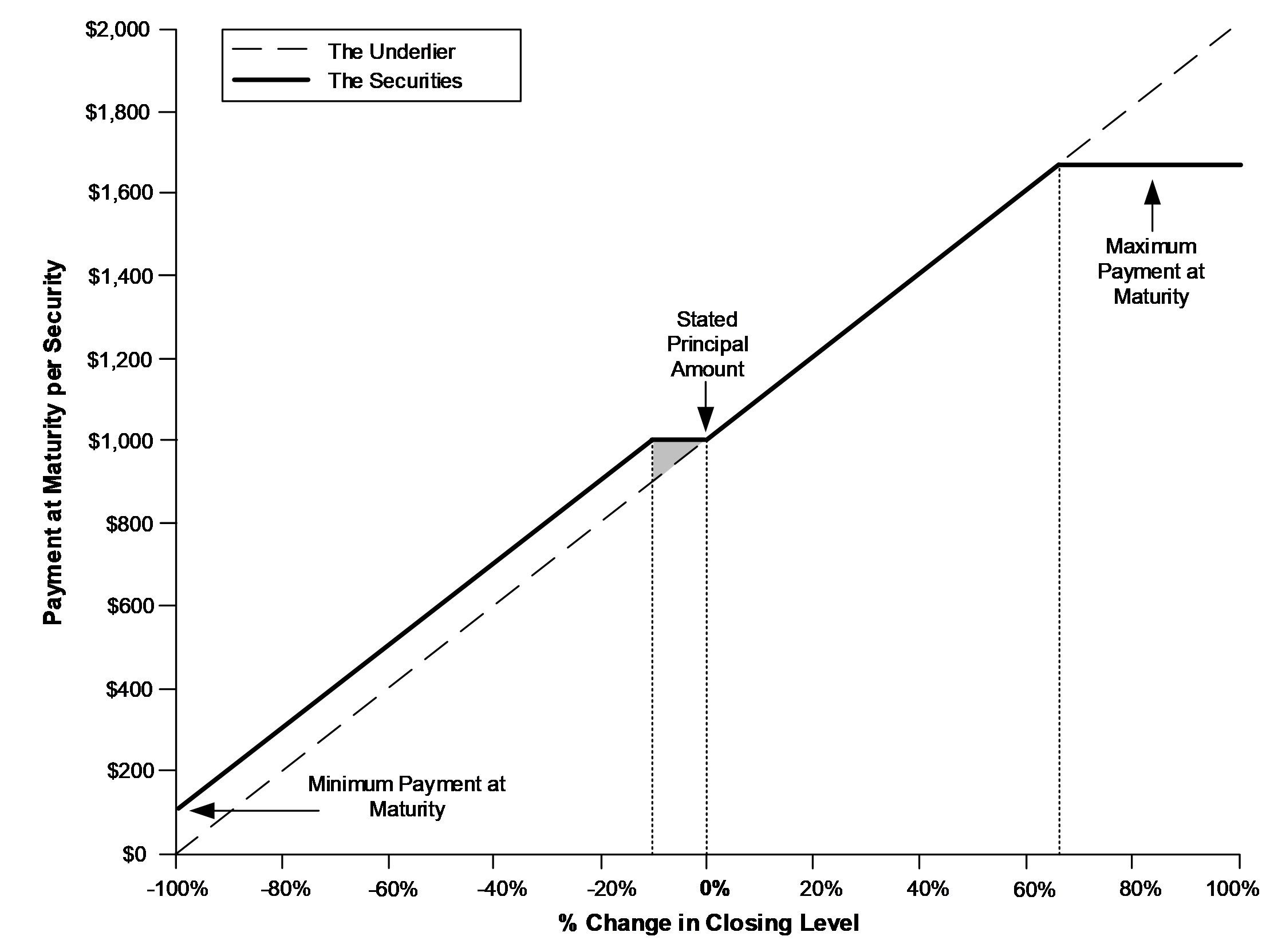 ■Payment at maturity. At maturity, if the final level is greater than the initial level, investors will receive the stated principal amount plus the upside payment, subject to the maximum payment at maturity. If the final level is equal to or less than the initial level but is greater than or equal to the buffer level, investors will receive only the stated principal amount. If, however, the final level is less than the buffer level, investors will lose 1% for every 1% decline in the level of the underlier beyond the specified buffer amount. Under these circumstances, the payment at maturity will be less, and may be significantly less, than the stated principal amount of the securities, subject to the minimum payment at maturity.