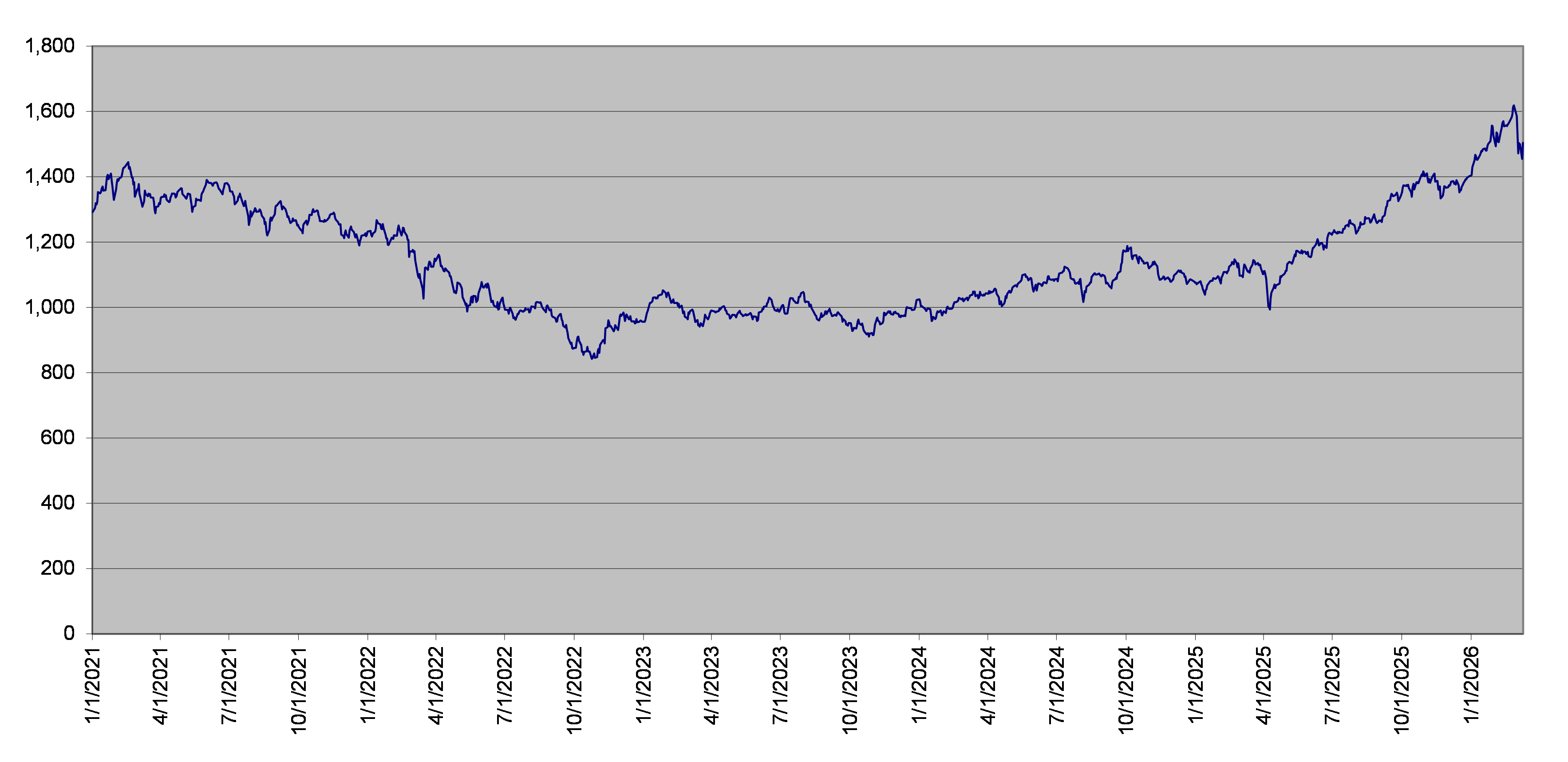The closing level of the underlier on March 10, 2026 was 1,504.33. The following graph sets forth the daily closing levels of the underlier for the period noted below. We obtained the historical information presented in this document from Bloomberg Financial Markets, without independent verification. The underlier has at times experienced periods of high volatility. You should not take the historical closing levels of the underlier as an indication of its future performance, and no assurance can be given as to the closing level of the underlier at any time.