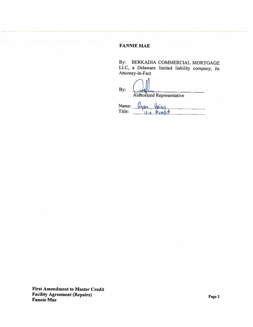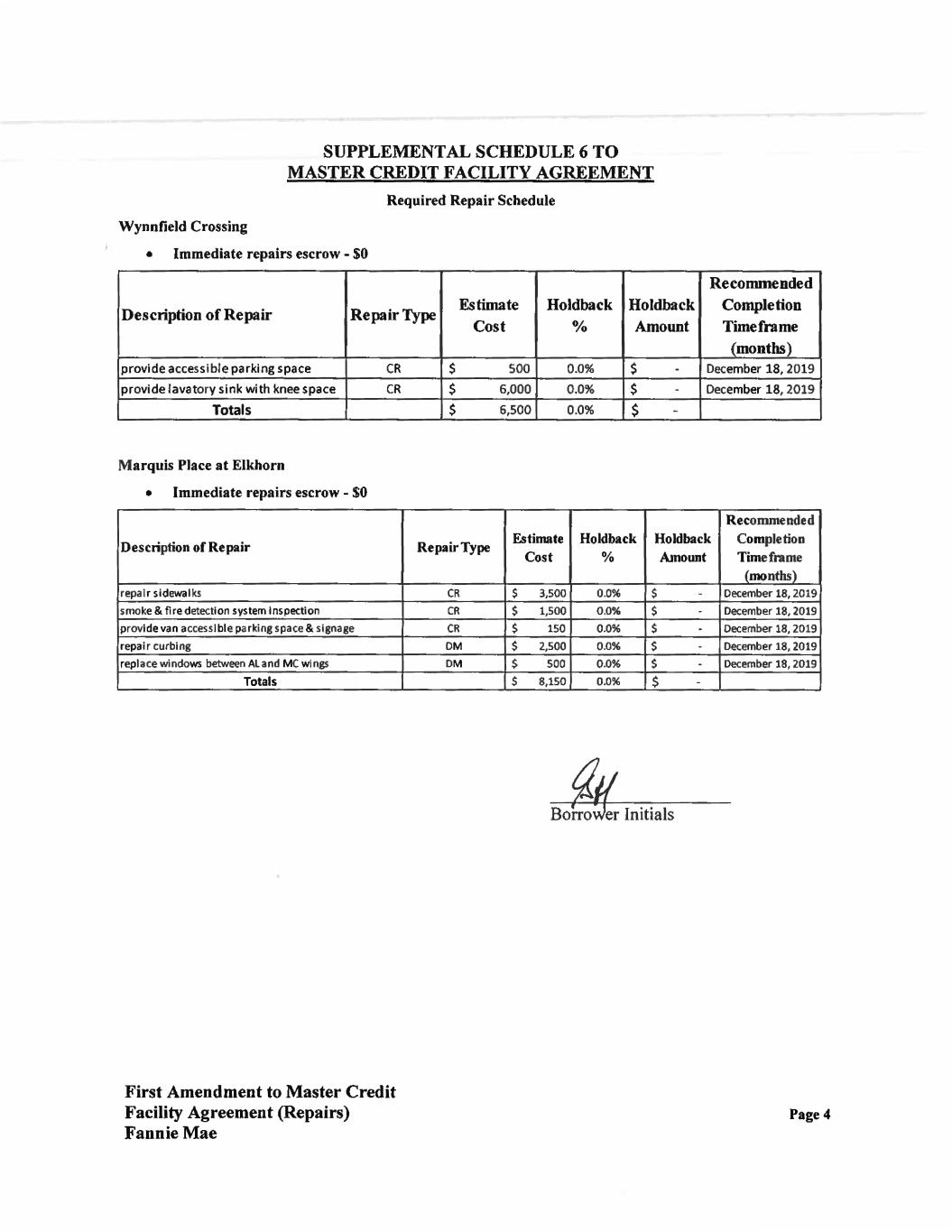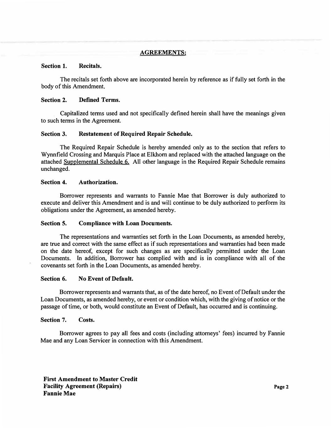 AGREEMENTS: Section 1. Recitals. The recitals set forth above are incorporated herein by reference as if fully set forth in the body of this Amendment. Section 2. Defined Terms. Capitalized terms used and not specifically defined herein shall have the meanings given to such terms in the Agreement. Section 3. Restatement of Required Repair Schedule. The Required Repair Schedule is hereby amended only as to the section that refers to Wynnfield Crossing and Marquis Place at Elkhorn and replaced with the attached language on the attached Supplemental Schedule 6. All other language in the Required Repair Schedule remains unchanged. Section 4. Authorization. Borrower represents and warrants to Fannie Mae that Borrower is duly authorized to execute and deliver this Amendment and is and will continue to be duly authorized to perform its obligations under the Agreement, as amended hereby. Section 5. Compliance with Loan Documents. The representations and warranties set forth in the Loan Documents, as amended hereby, are true and correct with the same effect as if such representations and warranties had been made on the date hereof, except for such changes as are specifically permitted under the Loan Documents. In addition, Borrower has complied with and is in compliance with all of the covenants set forth in the Loan Documents, as amended hereby. Section 6. No Event of Default. Borrower represents and warrants that, as of the date hereof, no Event of Default under the Loan Documents, as amended hereby, or event or condition which, with the giving of notice or the passage of time, or both, would constitute an Event of Default, has occurred and is continuing. Section 7. Costs. Borrower agrees to pay all fees and costs (including attorneys' fees) incurred by Fannie Mae and any Loan Servicer in connection with this Amendment. First Amendment to Master Credit Facility Agreement (Repairs) Fannie Mae Page 2