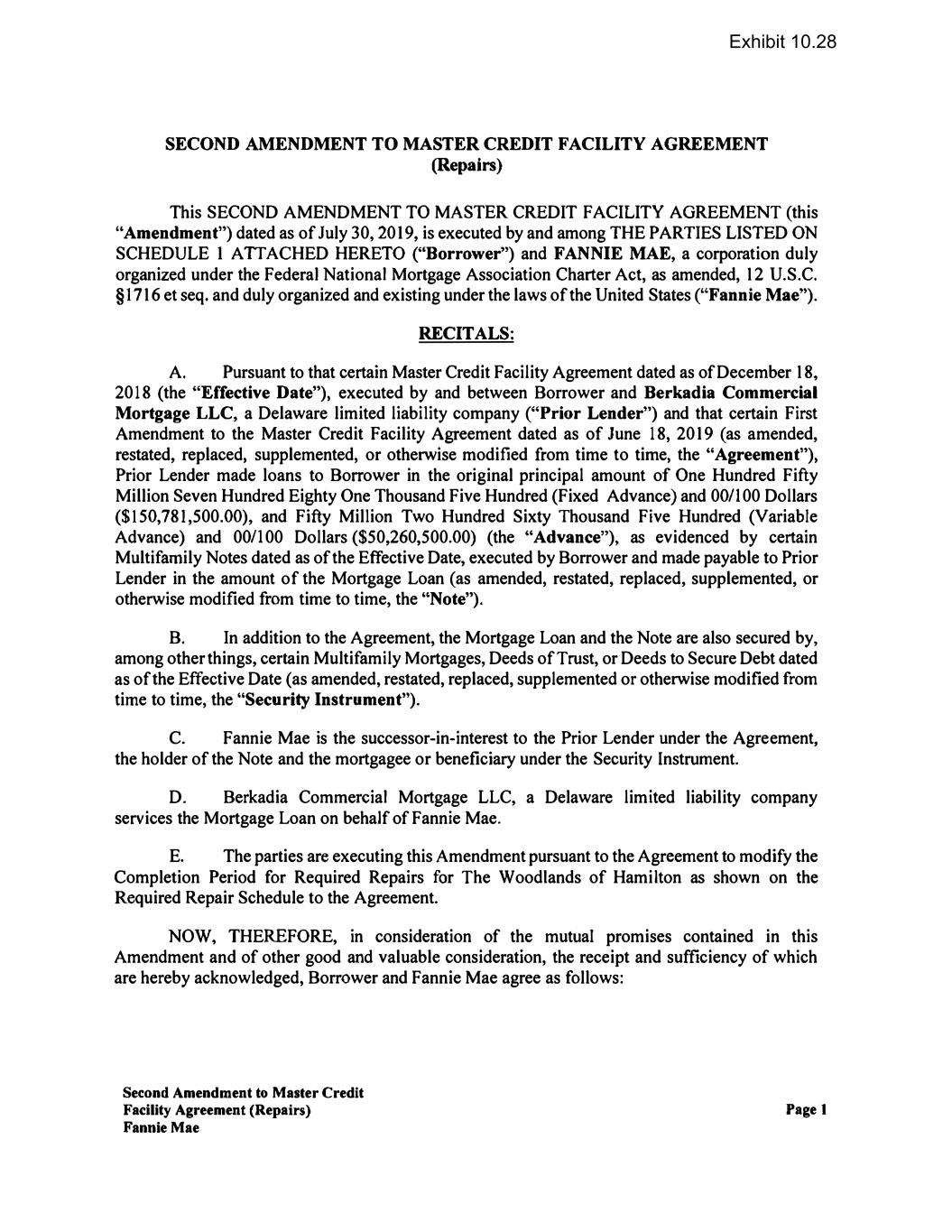 SECOND AMENDMENT TO MASTER CREDIT FACILITY AGREEMENT (Repairs) This SECOND AMENDMENT TO MASTER CREDIT FACILITY AGREEMENT (this "Amendment") dated as of July 30, 2019, is executed by and among THE PARTIES LISTED ON SCHEDULE 1 ATTACHED HERETO ("Borrower") and FANNIE MAE, a corporation duly organized under the Federal National Mortgage Association Charter Act, as amended, 12 U.S.C. § 1716 et seq. and duly organized and existing under the laws of the United States ("Fannie Mae"). RECITALS: A. Pursuant to that certain Master Credit Facility Agreement dated as of December 18, 2018 (the "Effective Date"), executed by and between Borrower and Berkadia Commercial Mortgage LLC, a Delaware limited liability company ("Prior Lender") and that certain First Amendment to the Master Credit Facility Agreement dated as of June 18, 2019 (as amended, restated, replaced, supplemented, or otherwise modified from time to time, the "Agreement"), Prior Lender made loans to Borrower in the original principal amount of One Hundred Fifty Million Seven Hundred Eighty One Thousand Five Hundred (Fixed Advance) and 00/100 Dollars ($150,781,500.00), and Fifty Million Two Hundred Sixty Thousand Five Hundred (Variable Advance) and 00/100 Dollars ($50,260,500.00) (the "Advance"), as evidenced by certain Multifamily Notes dated as of the Effective Date, executed by Borrower and made payable to Prior Lender in the amount of the Mortgage Loan (as amended, restated, replaced, supplemented, or otherwise modified from time to time, the "Note"). B. In addition to the Agreement, the Mortgage Loan and the Note are also secured by, among other things, certain Multifamily Mortgages, Deeds of Trust, or Deeds to Secure Debt dated as of the Effective Date (as amended, restated, replaced, supplemented or otherwise modified from time to time, the "Security Instrument"). C. Fannie Mae is the successor-in-interest to the Prior Lender under the Agreement, the holder of the Note and the mortgagee or beneficiary under the Security Instrument. D. Berkadia Commercial Mortgage LLC, a Delaware limited liability company services the Mortgage Loan on behalf of Fannie Mae. E. The parties are executing this Amendment pursuant to the Agreement to modify the Completion Period for Required Repairs for The Woodlands of Hamilton as shown on the Required Repair Schedule to the Agreement. NOW, THEREFORE, in consideration of the mutual promises contained in this Amendment and of other good and valuable consideration, the receipt and sufficiency of which are hereby acknowledged, Borrower and Fannie Mae agree as follows: Second Amendment to Master Credit Facility Agreement (Repairs) Fannie Mae Page 1 Exhibit 10.28