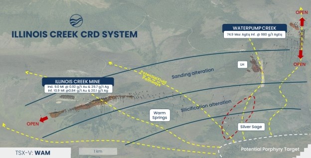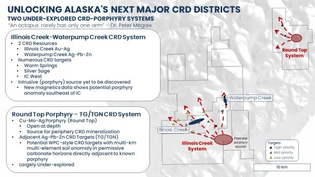 In addition to the planned drilling at Waterpump Creek and Silver Sage, Alaska Silver will advance a regional exploration initiative during the 2026 field season, reflecting the Company's evolving interpretation of the Illinois Creek district as having two carbonate replacement deposit-porphyry ("CRD-PPY") centers. with significant CRD potential developed within reactive carbonate stratigraphy surrounding each center. The first center (or "hub") is the well-established Illinois Creek system, where multiple components of a large CRD system have been identified, including the Waterpump Creek-Pb-Zn resource, the Illinois Creek Au-Ag resource, Silver Sage, Warm Springs, and other prospects. While the intrusive center responsible for mineralization at Illinois Creek has not yet been located, the geological, structural, geophysical and geochemical evidence strongly supports its presence at depth. 2026 will see continued exploration for CRD mineralization in the Illinois Creek system to connect the dots along this major 8-km long mineralization corridor.