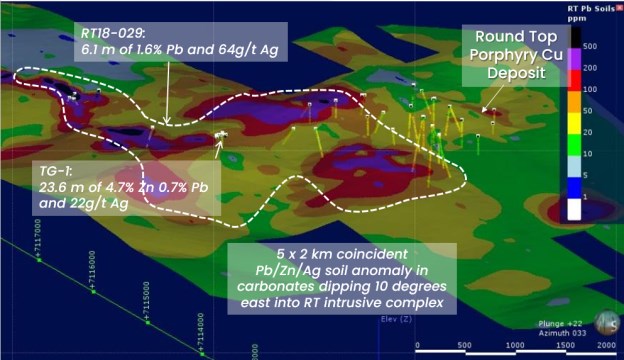 Within the Round Top hub, the TG and TG North ("TGN") CRD prospects represent high-priority targets and will be a primary focus for one of the Company's 2026 field exploration teams (Figure 3). Soil geochemistry outlines a strongly anomalous Ag-Pb-Zn trend extending over more than 5 km, with numerous samples exceeding 1,000 ppm lead, indicative of a robust and fertile mineralizing system. Reconnaissance mapping has identified multiple carbonate horizons interlayered with schist cap rocks, forming favorable stratigraphic and structural traps analogous to those hosting high-grade mineralization at Waterpump Creek.