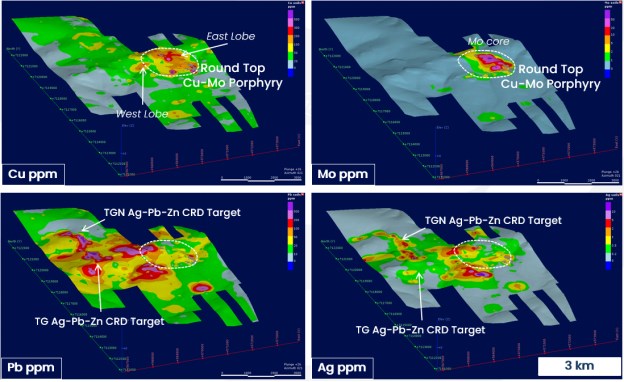 The second hub is centered on the Round Top Ag-Cu-Mo porphyry, located approximately 20 km from the Illinois Creek system. In contrast to Illinois Creek, the Round Top system exposes a well-defined mineralized intrusive porphyry center surrounded by extensive carbonate host rocks that exhibit strong, widespread geochemical leakage to surface, including highly anomalous silver, lead, and zinc values over multi-kilometer strike lengths.