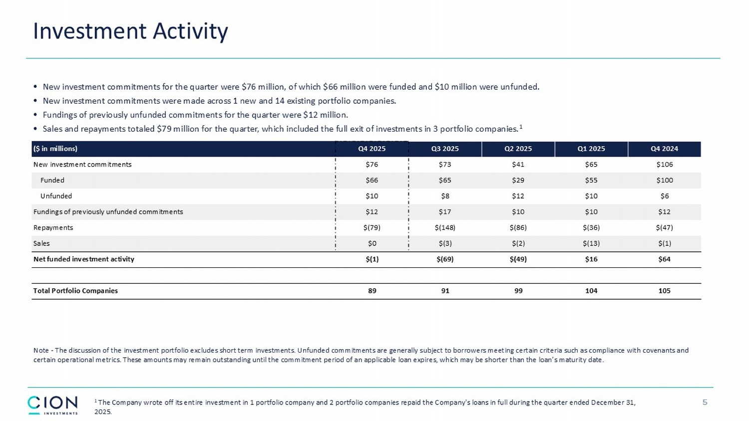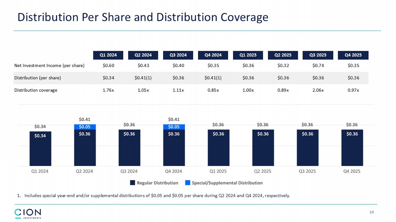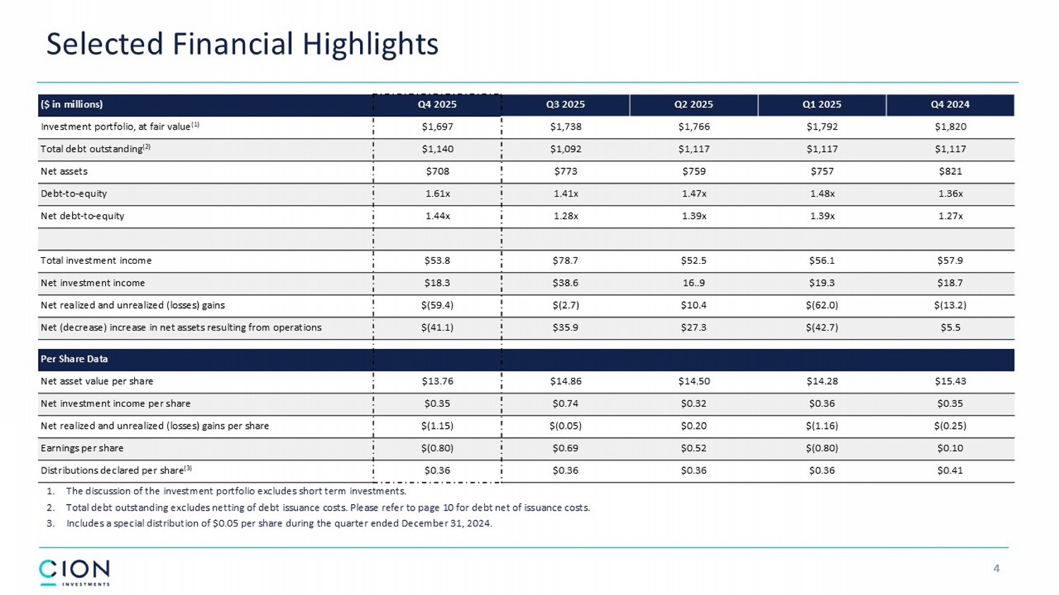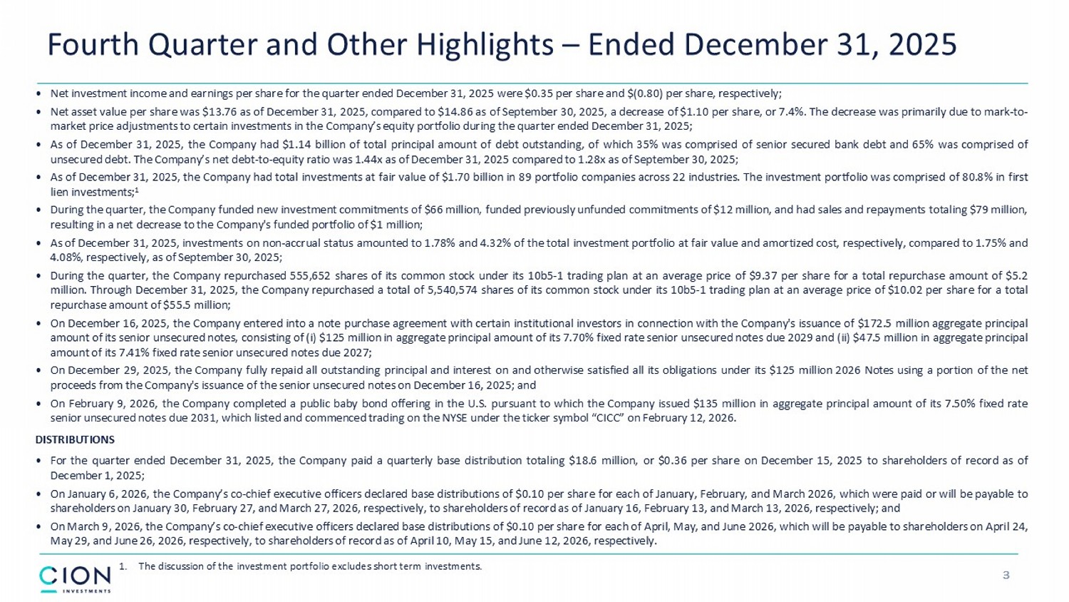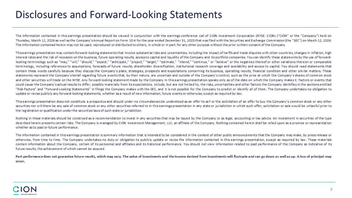 Disclosures and Forward - Looking Statements 2 The information contained in this earnings presentation should be viewed in conjunction with the earnings conference call of CION Investment Corporation (NYSE : CION) (“CION” or the “Company”) held on Thursday, March 12 , 2026 as well as the Company’s Annual Report on Form 10 - K for the year ended December 31 , 2025 that was filed with the Securities and Exchange Commission (the “SEC”) on March 12 , 2026 . The information contained herein may not be used, reproduced or distributed to others, in whole or in part, for any other purpose without the prior written consent of the Company . This earnings presentation may contain forward - looking statements that involve substantial risks and uncertainties, including the impact of tariffs and trade disputes with other countries, changes in inflation, high interest rates and the risk of recession on the business, future operating results, access to capital and liquidity of the Company and its portfolio companies . You can identify these statements by the use of forward - looking terminology such as “may,” “will,” “should,” “expect,” “anticipate,” “project,” “target,” “estimate,” “intend,” “continue,” or “believe” or the negatives thereof or other variations thereon or comparable terminology, including references to assumptions, forecasts of future results, shareholder diversification, institutional research coverage and availability and access to capital . You should read statements that contain these words carefully because they discuss the Company’s plans, strategies, prospects and expectations concerning its business, operating results, financial condition and other similar matters . These statements represent the Company’s belief regarding future events that, by their nature, are uncertain and outside of the Company’s control, such as the price at which the Company’s shares of common stock and other securities will trade on the NYSE . Any forward - looking statement made by the Company in this earnings presentation speaks only as of the date on which the Company makes it . Factors or events that could cause the Company’s actual results to differ, possibly materially from its expectations, include, but are not limited to, the risks, uncertainties and other factors the Company identifies in the sections entitled “Risk Factors” and “Forward - Looking Statements” in filings the Company makes with the SEC, and it is not possible for the Company to predict or identify all of them . The Company undertakes no obligation to update or revise publicly any forward - looking statements, whether as a result of new information, future events or otherwise, except as required by law . This earnings presentation does not constitute a prospectus and should under no circumstances be understood as an offer to sell or the solicitation of an offer to buy the Company’s common stock or any other securities nor will there be any sale of common stock or any other securities referred to in this earnings presentation in any state or jurisdiction in which such offer, solicitation or sale would be unlawful prior to the registration or qualification under the securities laws of such state or jurisdiction . Nothing in these materials should be construed as a recommendation to invest in any securities that may be issued by the Company or as legal, accounting or tax advice . An investment in securities of the type described herein presents certain risks . The Company is managed by CION Investment Management, LLC, an affiliate of the Company . Nothing contained herein shall be relied upon as a promise or representation whether as to past or future performance . The information contained in this earnings presentation is summary information that is intended to be considered in the context of other public announcements that the Company may make, by press release or otherwise, from time to time . The Company undertakes no duty or obligation to publicly update or revise the information contained in this earnings presentation, except as required by law . These materials contain information about the Company, certain of its personnel and affiliates and its historical performance . You should not view information related to past performance of the Company as indicative of its future results, the achievement of which cannot be assured . Past performance does not guarantee future results, which may vary . The value of investments and the income derived from investments will fluctuate and can go down as well as up . A loss of principal may occur .
