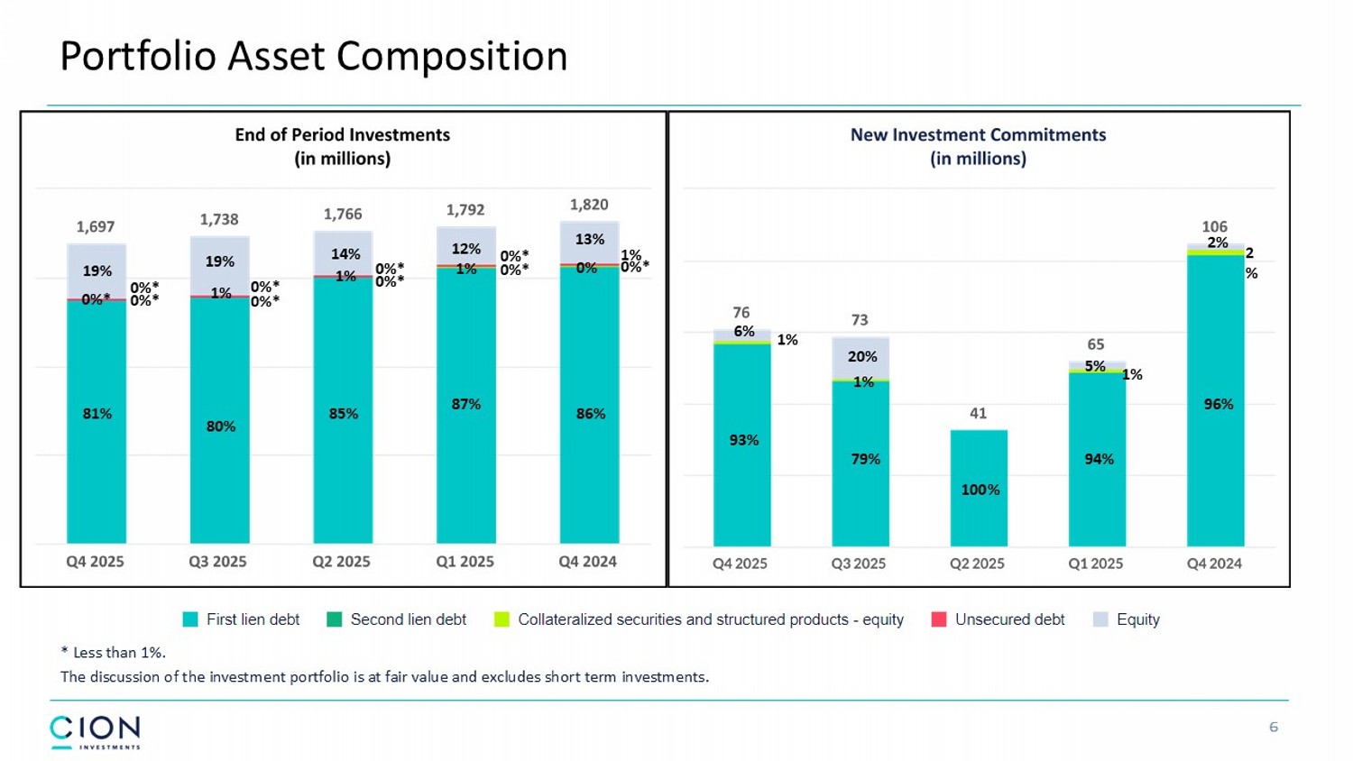 Investment Activity • New investment commitments for the quarter were $76 million, of which $66 million were funded and $10 million were unfunded. • New investment commitments were made across 1 new and 14 existing portfolio companies. • Fundings of previously unfunded commitments for the quarter were $12 million. • Sales and repayments totaled $79 million for the quarter, which included the full exit of investments in 3 portfolio companie s. 1 Note - The discussion of the investment portfolio excludes short term investments. Unfunded commitments are generally subject to borrowers meeting certain criteria such as compliance with covenants and certain operational metrics. These amounts may remain outstanding until the commitment period of an applicable loan expires, whi ch may be shorter than the loan’s maturity date. 5 Q4 2024 Q1 2025 Q2 2025 Q3 2025 Q4 2025 ($ in millions) $106 $65 $41 $73 $76 New investment commitments $100 $55 $29 $65 $66 Funded $6 $10 $12 $8 $10 Unfunded $12 $10 $10 $17 $12 Fundings of previously unfunded commitments $(47) $(36) $(86) $(148) $(79) Repayments $(1) $(13) $(2) $(3) $0 Sales $64 $16 $(49) $(69) $(1) Net funded investment activity 105 104 99 91 89 Total Portfolio Companies 1 The Company wrote off its entire investment in 1 portfolio company and 2 portfolio companies repaid the Company's loans in fu ll during the quarter ended December 31, 2025.