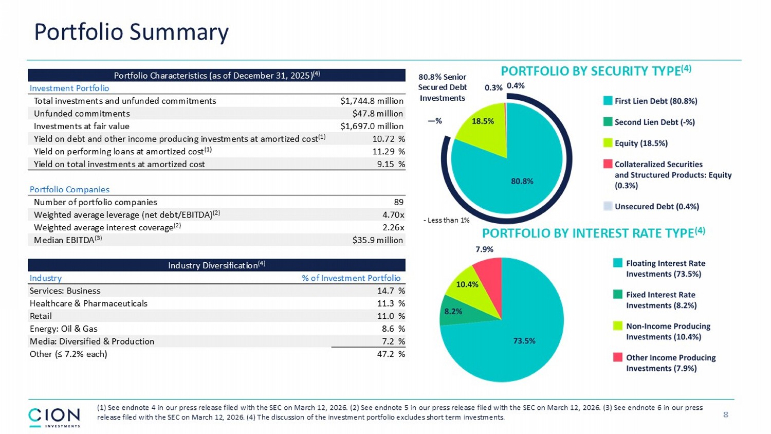 PORTFOLIO BY SECURITY TYPE (4) PORTFOLIO BY INTEREST RATE TYPE (4) Portfolio Summary 8 ( 1 ) See endnote 4 in our press release filed with the SEC on March 12 , 2026 . ( 2 ) See endnote 5 in our press release filed with the SEC on March 12 , 2026 . ( 3 ) See endnote 6 in our press release filed with the SEC on March 12 , 2026 . ( 4 ) The discussion of the investment portfolio excludes short term investments . Portfolio Characteristics (as of December 31, 2025) (4) Investment Portfolio $1,744.8 million Total investments and unfunded commitments $47.8 million Unfunded commitments $1,697.0 million Investments at fair value 10.72 % Yield on debt and other income producing investments at amortized cost (1) 11.29 % Yield on performing loans at amortized cost (1) 9.15 % Yield on total investments at amortized cost Portfolio Companies 89 Number of portfolio companies 4.70x Weighted average leverage (net debt/EBITDA) (2) 2.26x Weighted average interest coverage (2) $35.9 million Median EBITDA (3) Industry Diversification (4) % of Investment Portfolio Industry 14.7 % Services: Business 11.3 % Healthcare & Pharmaceuticals 11.0 % Retail 8.6 % Energy: Oil & Gas 7.2 % Media: Diversified & Production 47.2 % Other (≤ 7.2% each) 80.8% Senior Secured Debt Investments - Less than 1%