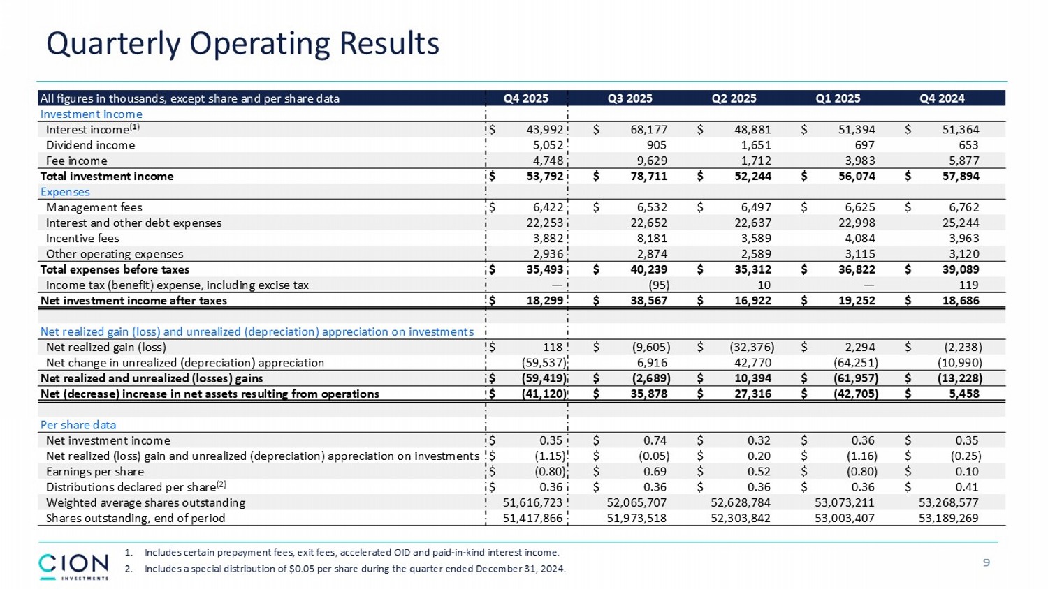 Quarterly Operating Results 9 Q4 2024 Q1 2025 Q2 2025 Q3 2025 Q4 2025 All figures in thousands, except share and per share data Investment income $ 51,364 $ 51,394 $ 48,881 $ 68,177 $ 43,992 Interest income (1) 653 697 1,651 905 5,052 Dividend income 5,877 3,983 1,712 9,629 4,748 Fee income $ 57,894 $ 56,074 $ 52,244 $ 78,711 $ 53,792 Total investment income Expenses $ 6,762 $ 6,625 $ 6,497 $ 6,532 $ 6,422 Management fees 25,244 22,998 22,637 22,652 22,253 Interest and other debt expenses 3,963 4,084 3,589 8,181 3,882 Incentive fees 3,120 3,115 2,589 2,874 2,936 Other operating expenses $ 39,089 $ 36,822 $ 35,312 $ 40,239 $ 35,493 Total expenses before taxes 119 — 10 (95) — Income tax (benefit) expense, including excise tax $ 18,686 $ 19,252 $ 16,922 $ 38,567 $ 18,299 Net investment income after taxes Net realized gain (loss) and unrealized (depreciation) appreciation on investments $ (2,238) $ 2,294 $ (32,376) $ (9,605) $ 118 Net realized gain (loss) (10,990) (64,251) 42,770 6,916 (59,537) Net change in unrealized (depreciation) appreciation $ (13,228) $ (61,957) $ 10,394 $ (2,689) $ (59,419) Net realized and unrealized (losses) gains $ 5,458 $ (42,705) $ 27,316 $ 35,878 $ (41,120) Net (decrease) increase in net assets resulting from operations Per share data $ 0.35 $ 0.36 $ 0.32 $ 0.74 $ 0.35 Net investment income $ (0.25) $ (1.16) $ 0.20 $ (0.05) $ (1.15) Net realized (loss) gain and unrealized (depreciation) appreciation on investments $ 0.10 $ (0.80) $ 0.52 $ 0.69 $ (0.80) Earnings per share $ 0.41 $ 0.36 $ 0.36 $ 0.36 $ 0.36 Distributions declared per share (2) 53,268,577 53,073,211 52,628,784 52,065,707 51,616,723 Weighted average shares outstanding 53,189,269 53,003,407 52,303,842 51,973,518 51,417,866 Shares outstanding, end of period 1. Includes certain prepayment fees, exit fees, accelerated OID and paid - in - kind interest income. 2. Includes a special distribution of $0.05 per share during the quarter ended December 31, 2024.