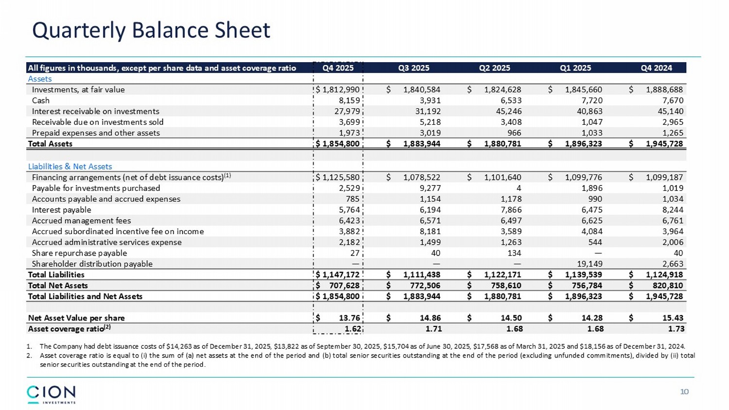 Quarterly Balance Sheet 10 Q4 2024 Q1 2025 Q2 2025 Q3 2025 Q4 2025 All figures in thousands, except per share data and asset coverage ratio Assets $ 1,888,688 $ 1,845,660 $ 1,824,628 $ 1,840,584 $ 1,812,990 Investments, at fair value 7,670 7,720 6,533 3,931 8,159 Cash 45,140 40,863 45,246 31,192 27,979 Interest receivable on investments 2,965 1,047 3,408 5,218 3,699 Receivable due on investments sold 1,265 1,033 966 3,019 1,973 Prepaid expenses and other assets $ 1,945,728 $ 1,896,323 $ 1,880,781 $ 1,883,944 $ 1,854,800 Total Assets Liabilities & Net Assets $ 1,099,187 $ 1,099,776 $ 1,101,640 $ 1,078,522 $ 1,125,580 Financing arrangements (net of debt issuance costs) (1) 1,019 1,896 4 9,277 2,529 Payable for investments purchased 1,034 990 1,178 1,154 785 Accounts payable and accrued expenses 8,244 6,475 7,866 6,194 5,764 Interest payable 6,761 6,625 6,497 6,571 6,423 Accrued management fees 3,964 4,084 3,589 8,181 3,882 Accrued subordinated incentive fee on income 2,006 544 1,263 1,499 2,182 Accrued administrative services expense 40 — 134 40 27 Share repurchase payable 2,663 19,149 — — — Shareholder distribution payable $ 1,124,918 $ 1,139,539 $ 1,122,171 $ 1,111,438 $ 1,147,172 Total Liabilities $ 820,810 $ 756,784 $ 758,610 $ 772,506 $ 707,628 Total Net Assets $ 1,945,728 $ 1,896,323 $ 1,880,781 $ 1,883,944 $ 1,854,800 Total Liabilities and Net Assets $ 15.43 $ 14.28 $ 14.50 $ 14.86 $ 13.76 Net Asset Value per share 1.73 1.68 1.68 1.71 1.62 Asset coverage ratio (2) 1. The Company had debt issuance costs of $ 14 , 263 as of December 31 , 2025 , $ 13 , 822 as of September 30 , 2025 , $ 15 , 704 as of June 30 , 2025 , $ 17 , 568 as of March 31 , 2025 and $ 18 , 156 as of December 31 , 2024 . 2. Asset coverage ratio is equal to (i) the sum of (a) net assets at the end of the period and (b) total senior securities outstanding at the end of the period (excluding unfunded commitments), divided by (ii) total senior securities outstanding at the end of the period .