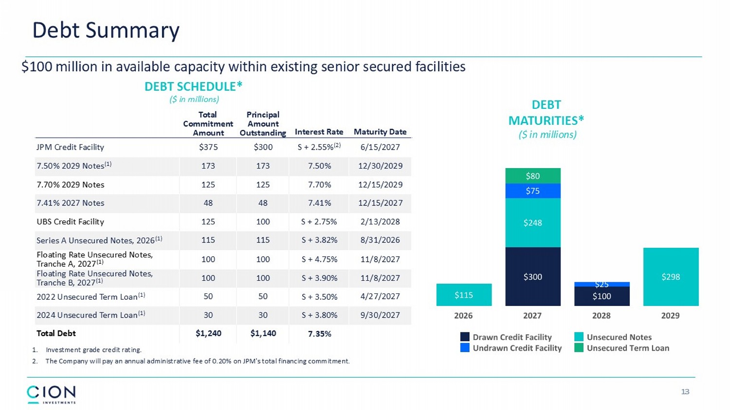 13 Maturity Date Interest Rate Principal Amount Outstanding Total Commitment Amount 6/15/2027 S + 2.55% (2) $300 $375 JPM Credit Facility 12/30/2029 7.50% 173 173 7.50% 2029 Notes (1) 12/15/2029 7.70% 125 125 7.70% 2029 Notes 12/15/2027 7.41% 48 48 7.41% 2027 Notes 2/13/2028 S + 2.75% 100 125 UBS Credit Facility 8/31/2026 S + 3.82% 115 115 Series A Unsecured Notes, 2026 (1) 11/8/2027 S + 4.75% 100 100 Floating Rate Unsecured Notes, Tranche A, 2027 (1) 11/8/2027 S + 3.90% 100 100 Floating Rate Unsecured Notes, Tranche B, 2027 (1) 4/27/2027 S + 3.50% 50 50 2022 Unsecured Term Loan (1) 9/30/2027 S + 3.80% 30 30 2024 Unsecured Term Loan (1) 7.35% $1,140 $1,240 Total Debt Debt Summary DEBT MATURITIES* ($ in millions) DEBT SCHEDULE* ($ in millions) $100 million in available capacity within existing senior secured facilities 1. Investment grade credit rating. 2. The Company will pay an annual administrative fee of 0.20% on JPM's total financing commitment.