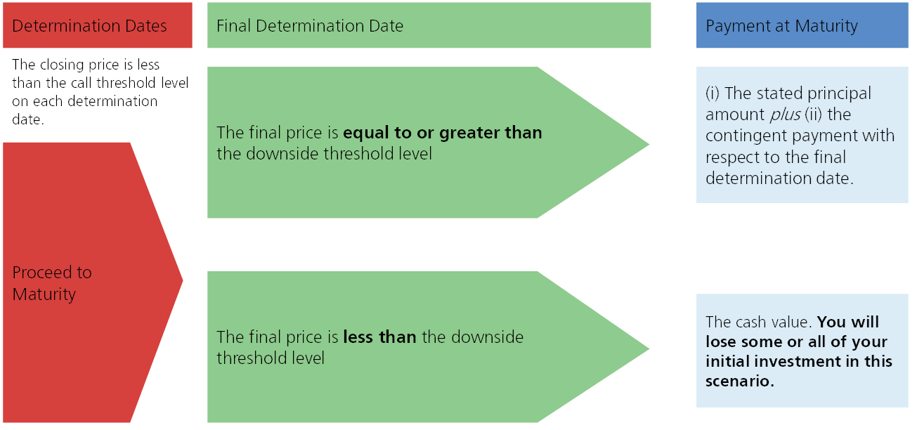 The securities offer the opportunity for investors to earn a contingent payment equal to $26.125 (equivalent to 10.45% per annum of the stated principal amount) per security, with respect to each determination date on which the closing price or the final price is equal to or greater than 70.00% of the initial price, which we refer to as the downside threshold level. The securities may be redeemed early for an early redemption amount equal to (i) the stated principal amount per security plus (ii) the applicable contingent payment and the payment at maturity will vary depending on the final price, as follows: