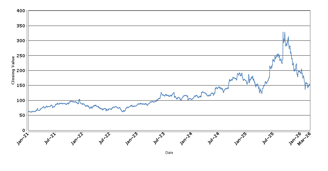 The graph below sets forth the historical performance of Palantir Technologies Inc. based on the daily Closing Value from November 26, 2024 through March 10, 2026. The Class A common stock of Palantir Technologies Inc. began trading on the Nasdaq Stock Exchange on November 26, 2024 and therefore has limited performance history. We obtained the Closing Values shown in the graph below from Bloomberg. We have not independently verified the accuracy or completeness of the information obtained from Bloomberg. These historical closing values may have been adjusted to reflect certain corporate actions such as stock splits and reverse stock splits.