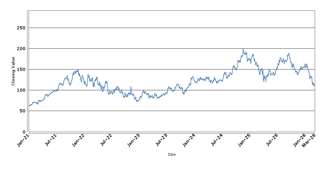 The graph below sets forth the historical performance of the Reference Asset based on the daily Closing Value from January 4, 2021 through March 10, 2026. We obtained the Closing Values shown in the graph below from Bloomberg. We have not independently verified the accuracy or completeness of the information obtained from Bloomberg. These historical closing values may have been adjusted to reflect certain corporate actions such as stock splits and reverse stock splits.