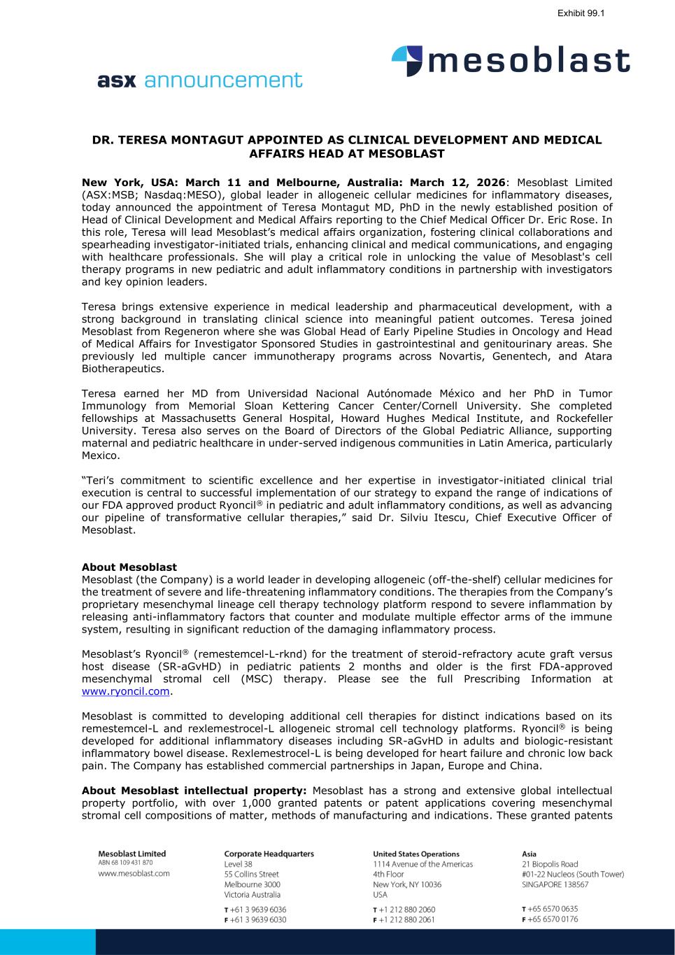 DR. TERESA MONTAGUT APPOINTED AS CLINICAL DEVELOPMENT AND MEDICAL AFFAIRS HEAD AT MESOBLAST New York, USA: March 11 and Melbourne, Australia: March 12, 2026: Mesoblast Limited (ASX:MSB; Nasdaq:MESO), global leader in allogeneic cellular medicines for inflammatory diseases, today announced the appointment of Teresa Montagut MD, PhD in the newly established position of Head of Clinical Development and Medical Affairs reporting to the Chief Medical Officer Dr. Eric Rose. In this role, Teresa will lead Mesoblast’s medical affairs organization, fostering clinical collaborations and spearheading investigator-initiated trials, enhancing clinical and medical communications, and engaging with healthcare professionals. She will play a critical role in unlocking the value of Mesoblast's cell therapy programs in new pediatric and adult inflammatory conditions in partnership with investigators and key opinion leaders. Teresa brings extensive experience in medical leadership and pharmaceutical development, with a strong background in translating clinical science into meaningful patient outcomes. Teresa joined Mesoblast from Regeneron where she was Global Head of Early Pipeline Studies in Oncology and Head of Medical Affairs for Investigator Sponsored Studies in gastrointestinal and genitourinary areas. She previously led multiple cancer immunotherapy programs across Novartis, Genentech, and Atara Biotherapeutics. Teresa earned her MD from Universidad Nacional Autónomade México and her PhD in Tumor Immunology from Memorial Sloan Kettering Cancer Center/Cornell University. She completed fellowships at Massachusetts General Hospital, Howard Hughes Medical Institute, and Rockefeller University. Teresa also serves on the Board of Directors of the Global Pediatric Alliance, supporting maternal and pediatric healthcare in under-served indigenous communities in Latin America, particularly Mexico. “Teri’s commitment to scientific excellence and her expertise in investigator-initiated clinical trial execution is central to successful implementation of our strategy to expand the range of indications of our FDA approved product Ryoncil® in pediatric and adult inflammatory conditions, as well as advancing our pipeline of transformative cellular therapies,” said Dr. Silviu Itescu, Chief Executive Officer of Mesoblast. About Mesoblast Mesoblast (the Company) is a world leader in developing allogeneic (off-the-shelf) cellular medicines for the treatment of severe and life-threatening inflammatory conditions. The therapies from the Company’s proprietary mesenchymal lineage cell therapy technology platform respond to severe inflammation by releasing anti-inflammatory factors that counter and modulate multiple effector arms of the immune system, resulting in significant reduction of the damaging inflammatory process. Mesoblast’s Ryoncil® (remestemcel-L-rknd) for the treatment of steroid-refractory acute graft versus host disease (SR-aGvHD) in pediatric patients 2 months and older is the first FDA-approved mesenchymal stromal cell (MSC) therapy. Please see the full Prescribing Information at www.ryoncil.com. Mesoblast is committed to developing additional cell therapies for distinct indications based on its remestemcel-L and rexlemestrocel-L allogeneic stromal cell technology platforms. Ryoncil® is being developed for additional inflammatory diseases including SR-aGvHD in adults and biologic-resistant inflammatory bowel disease. Rexlemestrocel-L is being developed for heart failure and chronic low back pain. The Company has established commercial partnerships in Japan, Europe and China. About Mesoblast intellectual property: Mesoblast has a strong and extensive global intellectual property portfolio, with over 1,000 granted patents or patent applications covering mesenchymal stromal cell compositions of matter, methods of manufacturing and indications. These granted patents