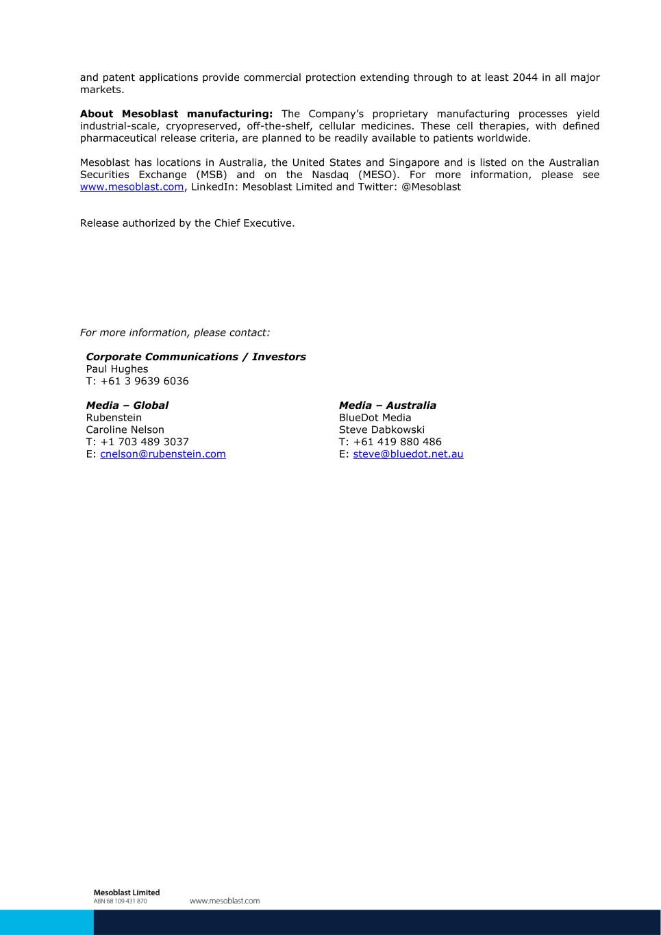 and patent applications provide commercial protection extending through to at least 2044 in all major markets. About Mesoblast manufacturing: The Company’s proprietary manufacturing processes yield industrial-scale, cryopreserved, off-the-shelf, cellular medicines. These cell therapies, with defined pharmaceutical release criteria, are planned to be readily available to patients worldwide. Mesoblast has locations in Australia, the United States and Singapore and is listed on the Australian Securities Exchange (MSB) and on the Nasdaq (MESO). For more information, please see www.mesoblast.com, LinkedIn: Mesoblast Limited and Twitter: @Mesoblast Release authorized by the Chief Executive. For more information, please contact: Corporate Communications / Investors Paul Hughes T: +61 3 9639 6036 Media – Global Media – Australia Rubenstein BlueDot Media Caroline Nelson Steve Dabkowski T: +1 703 489 3037 T: +61 419 880 486 E: cnelson@rubenstein.com E: steve@bluedot.net.au