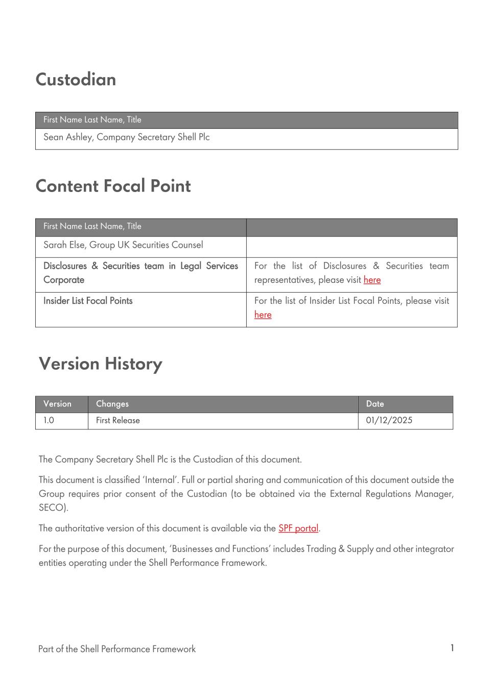 1 Part of the Shell Performance Framework Custodian First Name Last Name, Title Sean Ashley, Company Secretary Shell Plc Content Focal Point First Name Last Name, Title Sarah Else, Group UK Securities Counsel Disclosures & Securities team in Legal Services Corporate For the list of Disclosures & Securities team representatives, please visit here Insider List Focal Points For the list of Insider List Focal Points, please visit here Version History Version Changes Date 1.0 First Release 01/12/2025 The Company Secretary Shell Plc is the Custodian of this document. This document is classified ‘Internal’. Full or partial sharing and communication of this document outside the Group requires prior consent of the Custodian (to be obtained via the External Regulations Manager, SECO). The authoritative version of this document is available via the SPF portal. For the purpose of this document, ‘Businesses and Functions’ includes Trading & Supply and other integrator entities operating under the Shell Performance Framework.