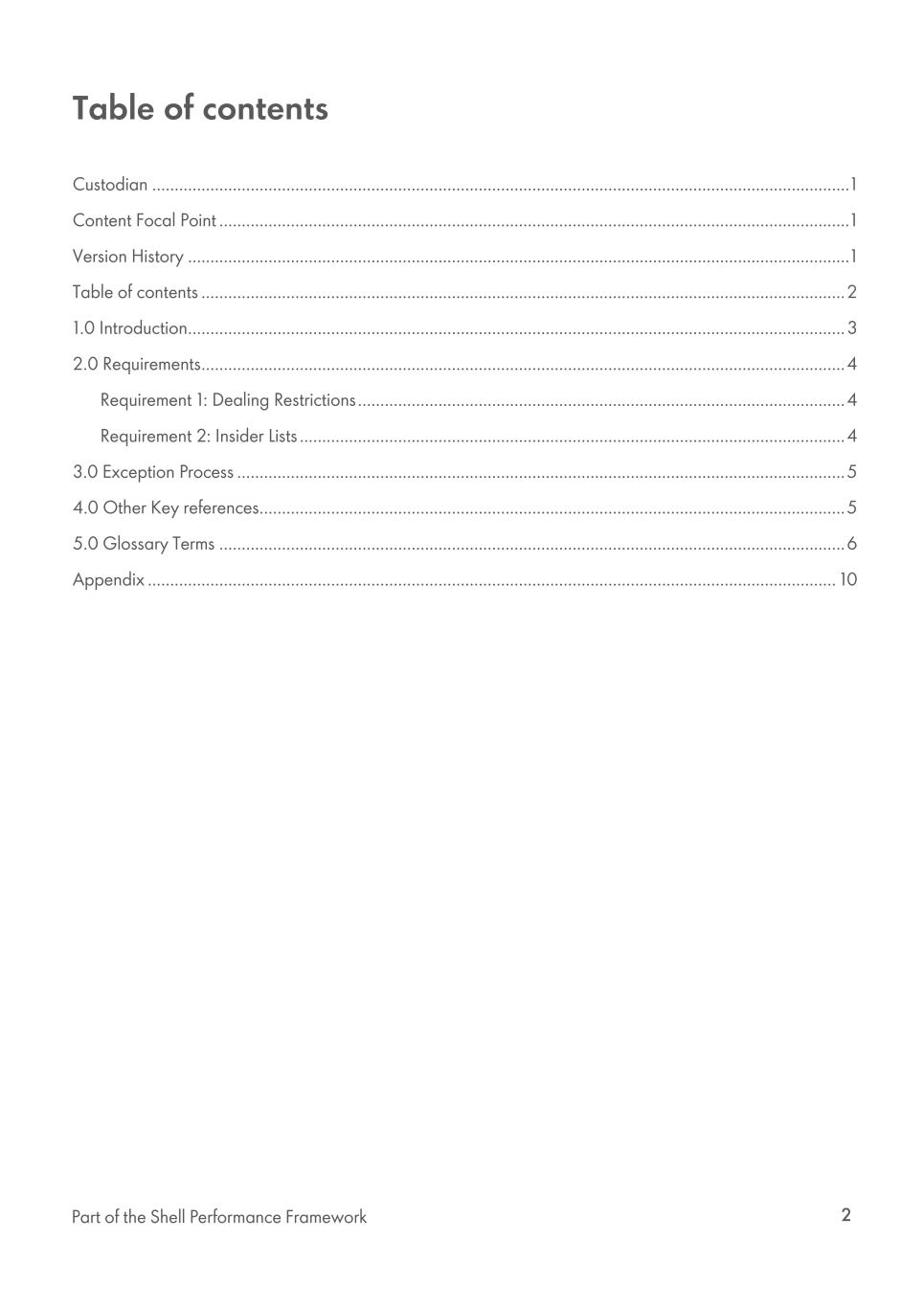 2 Part of the Shell Performance Framework Table of contents Custodian ............................................................................................................................................................ 1 Content Focal Point ............................................................................................................................................. 1 Version History .................................................................................................................................................... 1 Table of contents ................................................................................................................................................ 2 1.0 Introduction ................................................................................................................................................... 3 2.0 Requirements ................................................................................................................................................ 4 Requirement 1: Dealing Restrictions ............................................................................................................. 4 Requirement 2: Insider Lists .......................................................................................................................... 4 3.0 Exception Process ........................................................................................................................................ 5 4.0 Other Key references ................................................................................................................................... 5 5.0 Glossary Terms ............................................................................................................................................ 6 Appendix .......................................................................................................................................................... 10