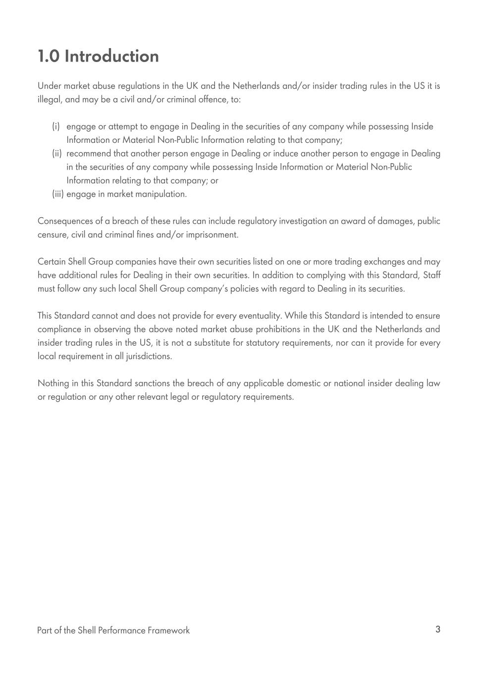 3 Part of the Shell Performance Framework 1.0 Introduction Under market abuse regulations in the UK and the Netherlands and/or insider trading rules in the US it is illegal, and may be a civil and/or criminal offence, to: (i) engage or attempt to engage in Dealing in the securities of any company while possessing Inside Information or Material Non-Public Information relating to that company; (ii) recommend that another person engage in Dealing or induce another person to engage in Dealing in the securities of any company while possessing Inside Information or Material Non-Public Information relating to that company; or (iii) engage in market manipulation. Consequences of a breach of these rules can include regulatory investigation an award of damages, public censure, civil and criminal fines and/or imprisonment. Certain Shell Group companies have their own securities listed on one or more trading exchanges and may have additional rules for Dealing in their own securities. In addition to complying with this Standard, Staff must follow any such local Shell Group company’s policies with regard to Dealing in its securities. This Standard cannot and does not provide for every eventuality. While this Standard is intended to ensure compliance in observing the above noted market abuse prohibitions in the UK and the Netherlands and insider trading rules in the US, it is not a substitute for statutory requirements, nor can it provide for every local requirement in all jurisdictions. Nothing in this Standard sanctions the breach of any applicable domestic or national insider dealing law or regulation or any other relevant legal or regulatory requirements.