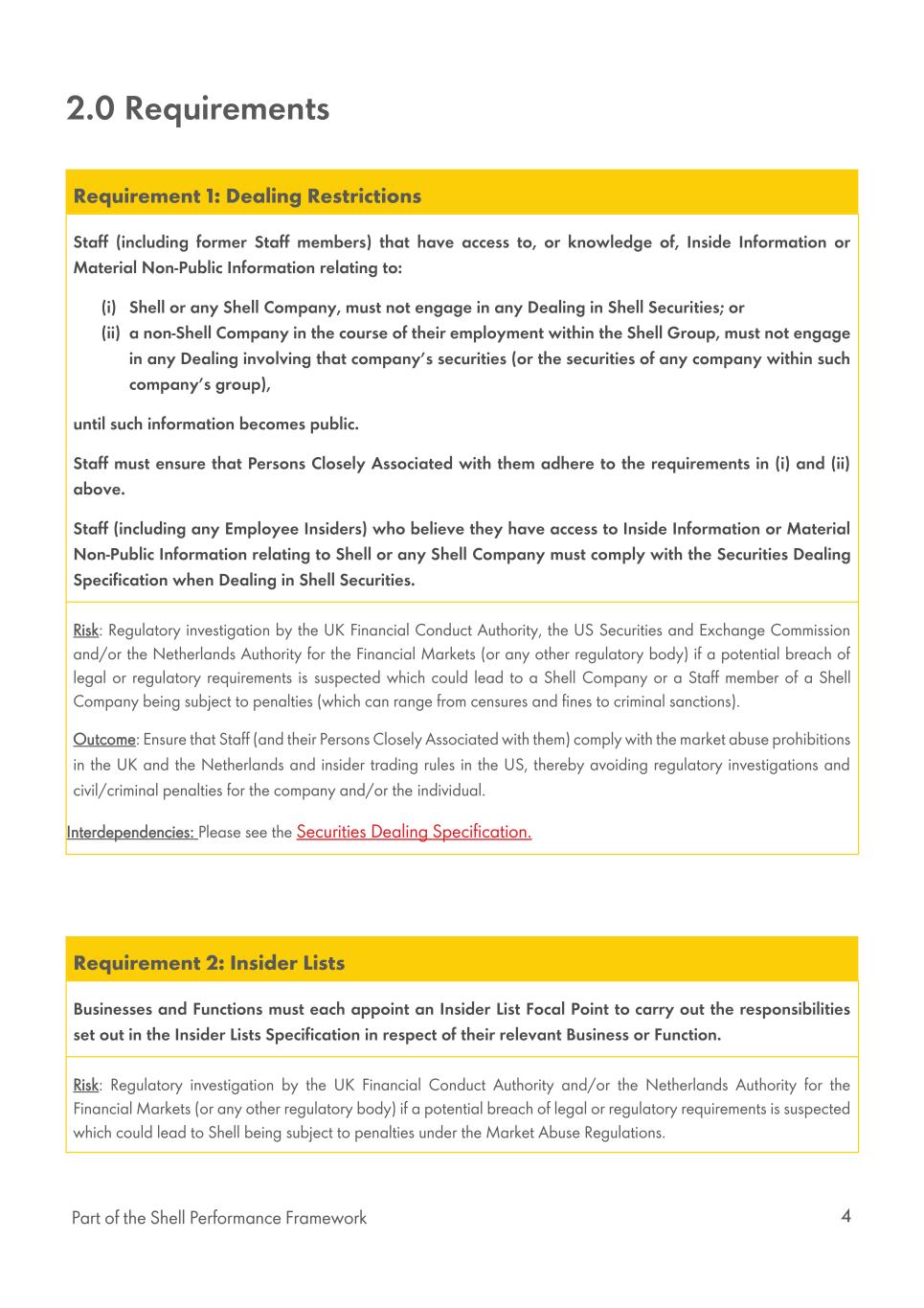 4 Part of the Shell Performance Framework 2.0 Requirements Requirement 1: Dealing Restrictions Staff (including former Staff members) that have access to, or knowledge of, Inside Information or Material Non-Public Information relating to: (i) Shell or any Shell Company, must not engage in any Dealing in Shell Securities; or (ii) a non-Shell Company in the course of their employment within the Shell Group, must not engage in any Dealing involving that company’s securities (or the securities of any company within such company’s group), until such information becomes public. Staff must ensure that Persons Closely Associated with them adhere to the requirements in (i) and (ii) above. Staff (including any Employee Insiders) who believe they have access to Inside Information or Material Non-Public Information relating to Shell or any Shell Company must comply with the Securities Dealing Specification when Dealing in Shell Securities. Risk: Regulatory investigation by the UK Financial Conduct Authority, the US Securities and Exchange Commission and/or the Netherlands Authority for the Financial Markets (or any other regulatory body) if a potential breach of legal or regulatory requirements is suspected which could lead to a Shell Company or a Staff member of a Shell Company being subject to penalties (which can range from censures and fines to criminal sanctions). Outcome: Ensure that Staff (and their Persons Closely Associated with them) comply with the market abuse prohibitions in the UK and the Netherlands and insider trading rules in the US, thereby avoiding regulatory investigations and civil/criminal penalties for the company and/or the individual. Interdependencies: Please see the Securities Dealing Specification. Requirement 2: Insider Lists Businesses and Functions must each appoint an Insider List Focal Point to carry out the responsibilities set out in the Insider Lists Specification in respect of their relevant Business or Function. Risk: Regulatory investigation by the UK Financial Conduct Authority and/or the Netherlands Authority for the Financial Markets (or any other regulatory body) if a potential breach of legal or regulatory requirements is suspected which could lead to Shell being subject to penalties under the Market Abuse Regulations.