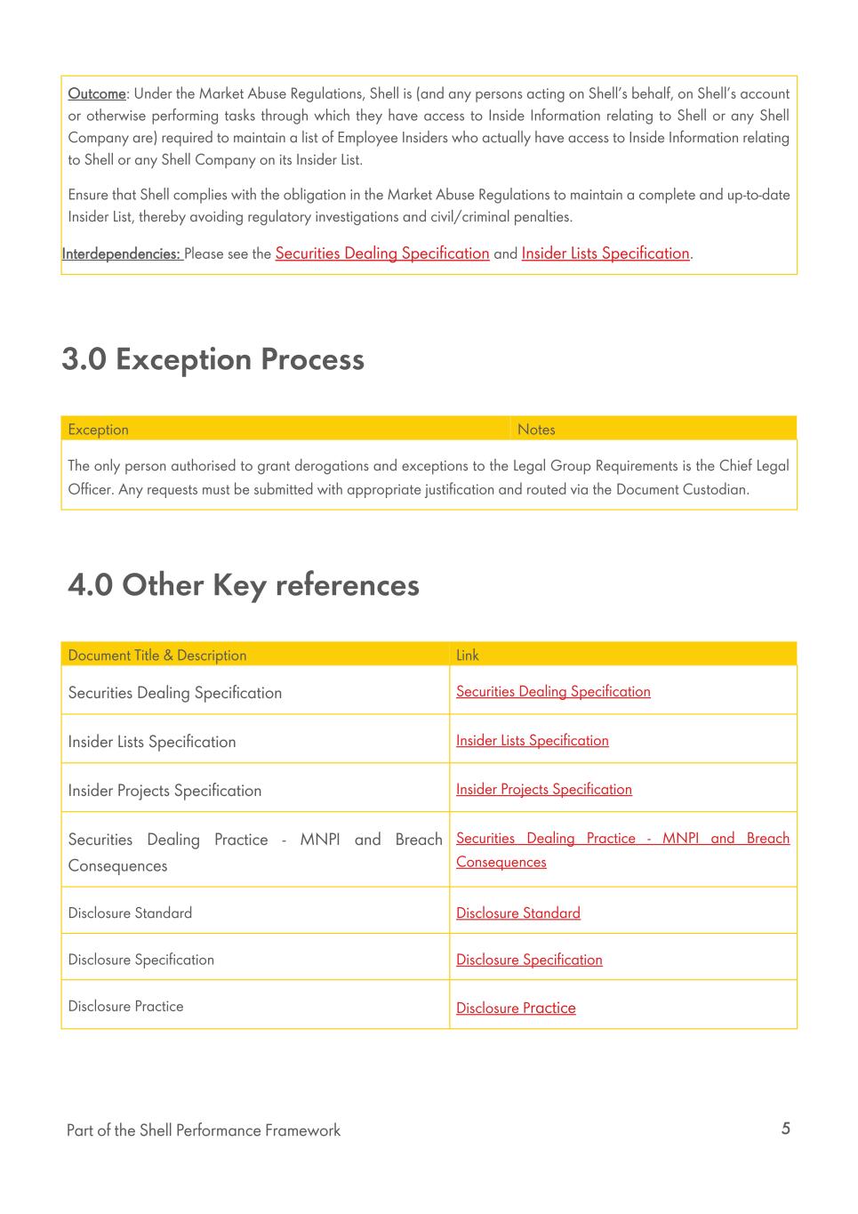 5 Part of the Shell Performance Framework Outcome: Under the Market Abuse Regulations, Shell is (and any persons acting on Shell’s behalf, on Shell’s account or otherwise performing tasks through which they have access to Inside Information relating to Shell or any Shell Company are) required to maintain a list of Employee Insiders who actually have access to Inside Information relating to Shell or any Shell Company on its Insider List. Ensure that Shell complies with the obligation in the Market Abuse Regulations to maintain a complete and up-to-date Insider List, thereby avoiding regulatory investigations and civil/criminal penalties. Interdependencies: Please see the Securities Dealing Specification and Insider Lists Specification. 3.0 Exception Process Exception Notes The only person authorised to grant derogations and exceptions to the Legal Group Requirements is the Chief Legal Officer. Any requests must be submitted with appropriate justification and routed via the Document Custodian. 4.0 Other Key references Document Title & Description Link Securities Dealing Specification Securities Dealing Specification Insider Lists Specification Insider Lists Specification Insider Projects Specification Insider Projects Specification Securities Dealing Practice - MNPI and Breach Consequences Securities Dealing Practice - MNPI and Breach Consequences Disclosure Standard Disclosure Standard Disclosure Specification Disclosure Specification Disclosure Practice Disclosure Practice