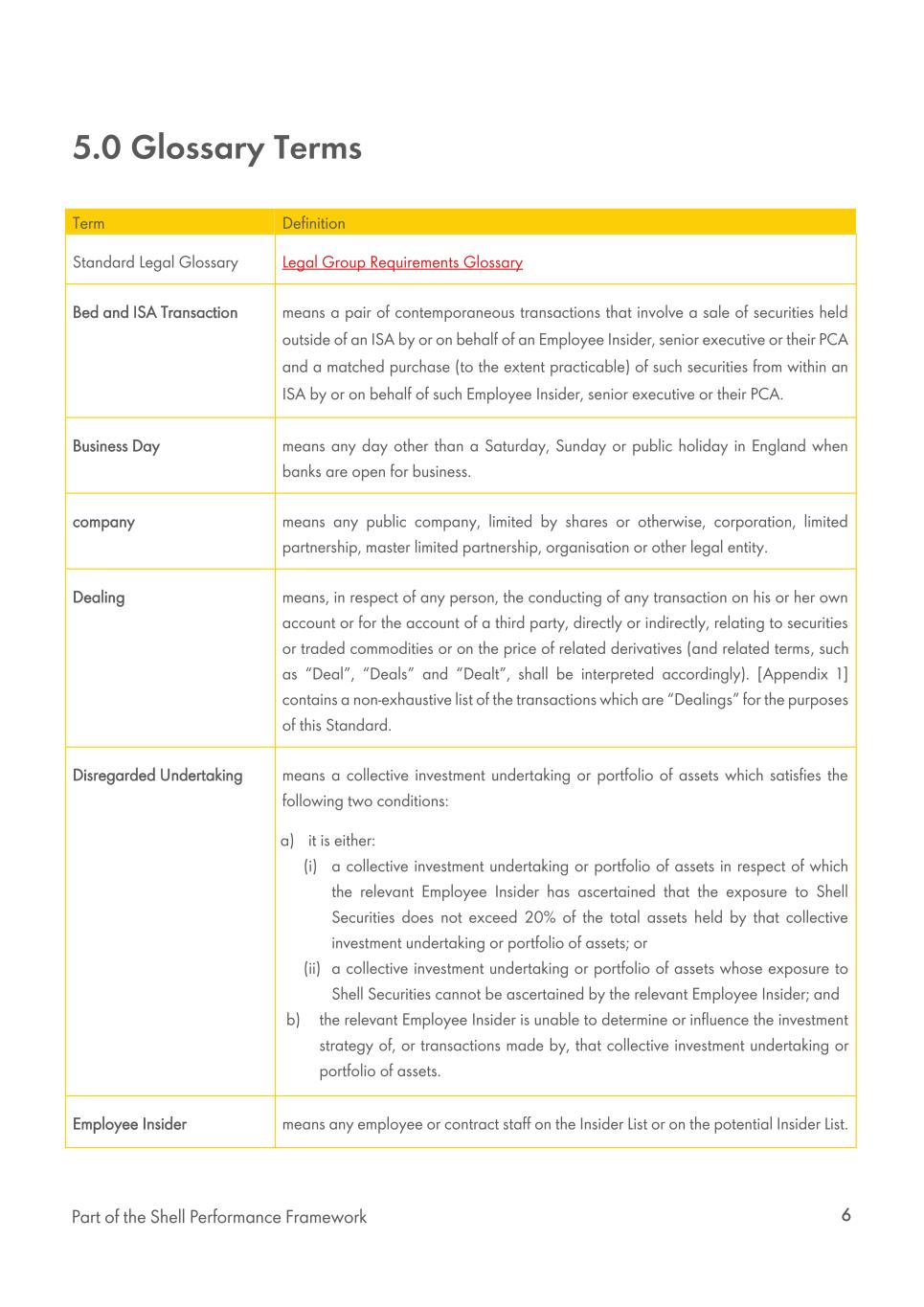6 Part of the Shell Performance Framework 5.0 Glossary Terms Term Definition Standard Legal Glossary Legal Group Requirements Glossary Bed and ISA Transaction means a pair of contemporaneous transactions that involve a sale of securities held outside of an ISA by or on behalf of an Employee Insider, senior executive or their PCA and a matched purchase (to the extent practicable) of such securities from within an ISA by or on behalf of such Employee Insider, senior executive or their PCA. Business Day means any day other than a Saturday, Sunday or public holiday in England when banks are open for business. company means any public company, limited by shares or otherwise, corporation, limited partnership, master limited partnership, organisation or other legal entity. Dealing means, in respect of any person, the conducting of any transaction on his or her own account or for the account of a third party, directly or indirectly, relating to securities or traded commodities or on the price of related derivatives (and related terms, such as “Deal”, “Deals” and “Dealt”, shall be interpreted accordingly). [Appendix 1] contains a non-exhaustive list of the transactions which are “Dealings” for the purposes of this Standard. Disregarded Undertaking means a collective investment undertaking or portfolio of assets which satisfies the following two conditions: a) it is either: (i) a collective investment undertaking or portfolio of assets in respect of which the relevant Employee Insider has ascertained that the exposure to Shell Securities does not exceed 20% of the total assets held by that collective investment undertaking or portfolio of assets; or (ii) a collective investment undertaking or portfolio of assets whose exposure to Shell Securities cannot be ascertained by the relevant Employee Insider; and b) the relevant Employee Insider is unable to determine or influence the investment strategy of, or transactions made by, that collective investment undertaking or portfolio of assets. Employee Insider means any employee or contract staff on the Insider List or on the potential Insider List.