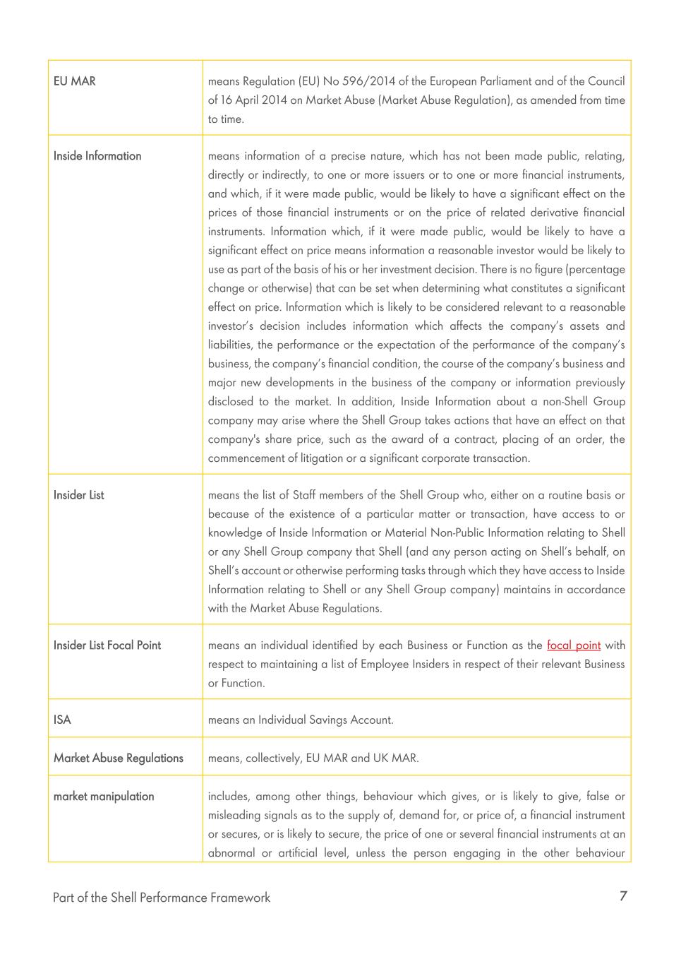 7 Part of the Shell Performance Framework EU MAR means Regulation (EU) No 596/2014 of the European Parliament and of the Council of 16 April 2014 on Market Abuse (Market Abuse Regulation), as amended from time to time. Inside Information means information of a precise nature, which has not been made public, relating, directly or indirectly, to one or more issuers or to one or more financial instruments, and which, if it were made public, would be likely to have a significant effect on the prices of those financial instruments or on the price of related derivative financial instruments. Information which, if it were made public, would be likely to have a significant effect on price means information a reasonable investor would be likely to use as part of the basis of his or her investment decision. There is no figure (percentage change or otherwise) that can be set when determining what constitutes a significant effect on price. Information which is likely to be considered relevant to a reasonable investor’s decision includes information which affects the company’s assets and liabilities, the performance or the expectation of the performance of the company’s business, the company’s financial condition, the course of the company’s business and major new developments in the business of the company or information previously disclosed to the market. In addition, Inside Information about a non-Shell Group company may arise where the Shell Group takes actions that have an effect on that company's share price, such as the award of a contract, placing of an order, the commencement of litigation or a significant corporate transaction. Insider List means the list of Staff members of the Shell Group who, either on a routine basis or because of the existence of a particular matter or transaction, have access to or knowledge of Inside Information or Material Non-Public Information relating to Shell or any Shell Group company that Shell (and any person acting on Shell’s behalf, on Shell’s account or otherwise performing tasks through which they have access to Inside Information relating to Shell or any Shell Group company) maintains in accordance with the Market Abuse Regulations. Insider List Focal Point means an individual identified by each Business or Function as the focal point with respect to maintaining a list of Employee Insiders in respect of their relevant Business or Function. ISA means an Individual Savings Account. Market Abuse Regulations means, collectively, EU MAR and UK MAR. market manipulation includes, among other things, behaviour which gives, or is likely to give, false or misleading signals as to the supply of, demand for, or price of, a financial instrument or secures, or is likely to secure, the price of one or several financial instruments at an abnormal or artificial level, unless the person engaging in the other behaviour