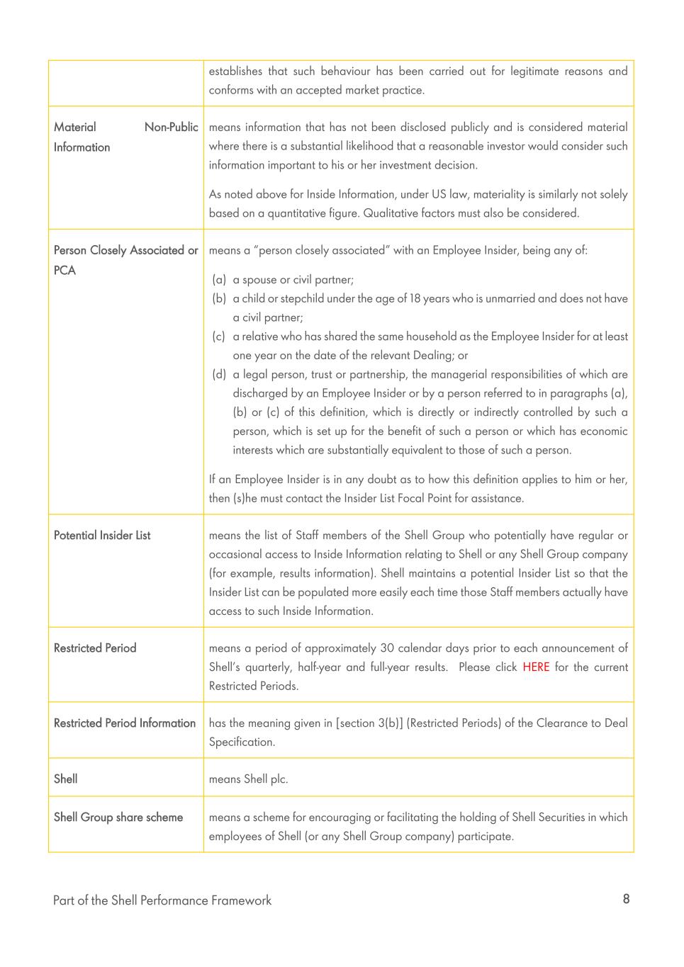 8 Part of the Shell Performance Framework establishes that such behaviour has been carried out for legitimate reasons and conforms with an accepted market practice. Material Non-Public Information means information that has not been disclosed publicly and is considered material where there is a substantial likelihood that a reasonable investor would consider such information important to his or her investment decision. As noted above for Inside Information, under US law, materiality is similarly not solely based on a quantitative figure. Qualitative factors must also be considered. Person Closely Associated or PCA means a “person closely associated” with an Employee Insider, being any of: (a) a spouse or civil partner; (b) a child or stepchild under the age of 18 years who is unmarried and does not have a civil partner; (c) a relative who has shared the same household as the Employee Insider for at least one year on the date of the relevant Dealing; or (d) a legal person, trust or partnership, the managerial responsibilities of which are discharged by an Employee Insider or by a person referred to in paragraphs (a), (b) or (c) of this definition, which is directly or indirectly controlled by such a person, which is set up for the benefit of such a person or which has economic interests which are substantially equivalent to those of such a person. If an Employee Insider is in any doubt as to how this definition applies to him or her, then (s)he must contact the Insider List Focal Point for assistance. Potential Insider List means the list of Staff members of the Shell Group who potentially have regular or occasional access to Inside Information relating to Shell or any Shell Group company (for example, results information). Shell maintains a potential Insider List so that the Insider List can be populated more easily each time those Staff members actually have access to such Inside Information. Restricted Period means a period of approximately 30 calendar days prior to each announcement of Shell’s quarterly, half-year and full-year results. Please click HERE for the current Restricted Periods. Restricted Period Information has the meaning given in [section 3(b)] (Restricted Periods) of the Clearance to Deal Specification. Shell means Shell plc. Shell Group share scheme means a scheme for encouraging or facilitating the holding of Shell Securities in which employees of Shell (or any Shell Group company) participate.