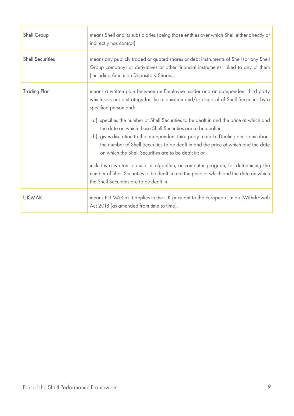 9 Part of the Shell Performance Framework Shell Group means Shell and its subsidiaries (being those entities over which Shell either directly or indirectly has control). Shell Securities means any publicly traded or quoted shares or debt instruments of Shell (or any Shell Group company) or derivatives or other financial instruments linked to any of them (including American Depository Shares). Trading Plan means a written plan between an Employee Insider and an independent third party which sets out a strategy for the acquisition and/or disposal of Shell Securities by a specified person and: (a) specifies the number of Shell Securities to be dealt in and the price at which and the date on which those Shell Securities are to be dealt in; (b) gives discretion to that independent third party to make Dealing decisions about the number of Shell Securities to be dealt in and the price at which and the date on which the Shell Securities are to be dealt in; or includes a written formula or algorithm, or computer program, for determining the number of Shell Securities to be dealt in and the price at which and the date on which the Shell Securities are to be dealt in. UK MAR means EU MAR as it applies in the UK pursuant to the European Union (Withdrawal) Act 2018 (as amended from time to time).