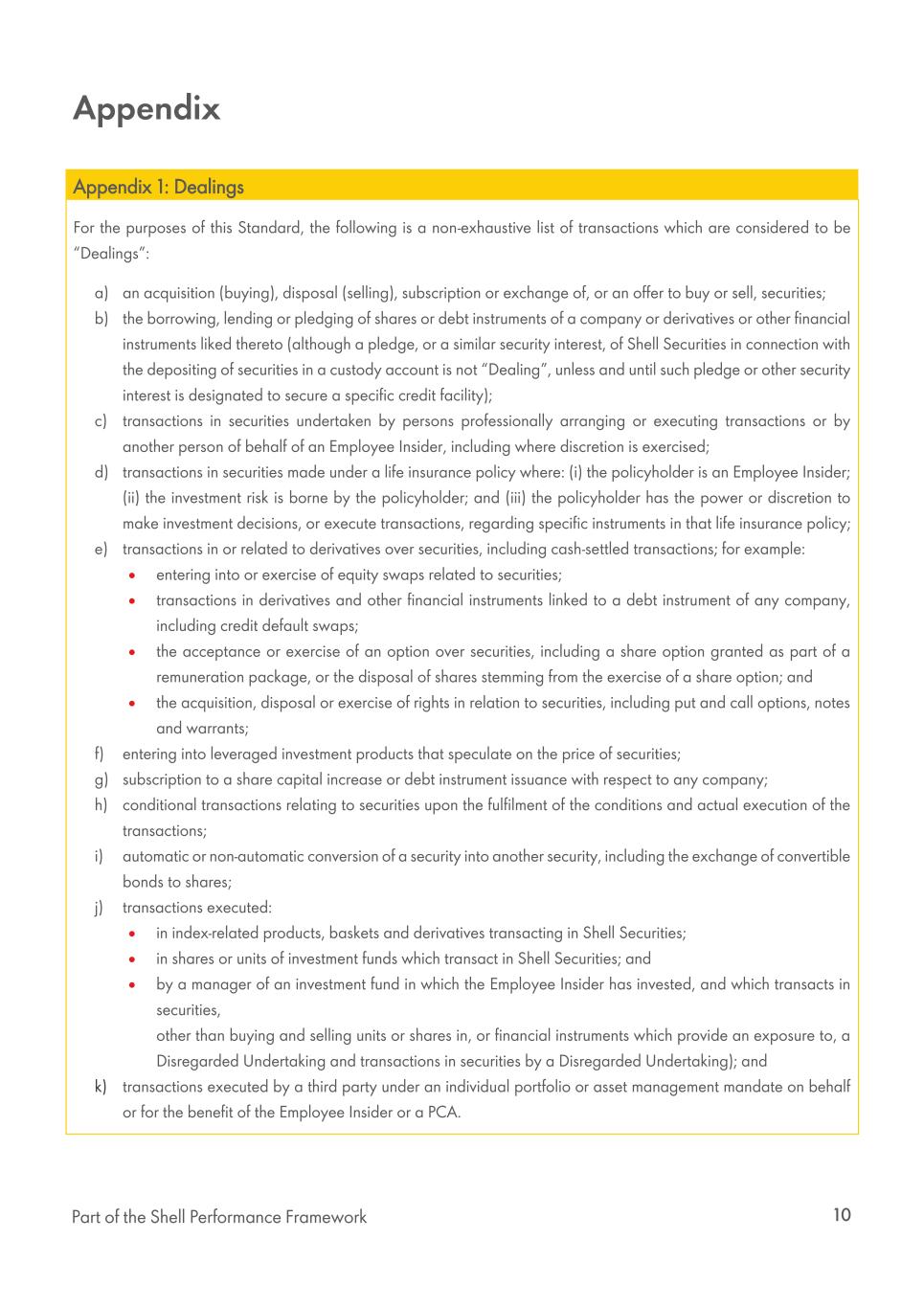 10 Part of the Shell Performance Framework Appendix Appendix 1: Dealings For the purposes of this Standard, the following is a non-exhaustive list of transactions which are considered to be “Dealings”: a) an acquisition (buying), disposal (selling), subscription or exchange of, or an offer to buy or sell, securities; b) the borrowing, lending or pledging of shares or debt instruments of a company or derivatives or other financial instruments liked thereto (although a pledge, or a similar security interest, of Shell Securities in connection with the depositing of securities in a custody account is not “Dealing”, unless and until such pledge or other security interest is designated to secure a specific credit facility); c) transactions in securities undertaken by persons professionally arranging or executing transactions or by another person of behalf of an Employee Insider, including where discretion is exercised; d) transactions in securities made under a life insurance policy where: (i) the policyholder is an Employee Insider; (ii) the investment risk is borne by the policyholder; and (iii) the policyholder has the power or discretion to make investment decisions, or execute transactions, regarding specific instruments in that life insurance policy; e) transactions in or related to derivatives over securities, including cash-settled transactions; for example: • entering into or exercise of equity swaps related to securities; • transactions in derivatives and other financial instruments linked to a debt instrument of any company, including credit default swaps; • the acceptance or exercise of an option over securities, including a share option granted as part of a remuneration package, or the disposal of shares stemming from the exercise of a share option; and • the acquisition, disposal or exercise of rights in relation to securities, including put and call options, notes and warrants; f) entering into leveraged investment products that speculate on the price of securities; g) subscription to a share capital increase or debt instrument issuance with respect to any company; h) conditional transactions relating to securities upon the fulfilment of the conditions and actual execution of the transactions; i) automatic or non-automatic conversion of a security into another security, including the exchange of convertible bonds to shares; j) transactions executed: • in index-related products, baskets and derivatives transacting in Shell Securities; • in shares or units of investment funds which transact in Shell Securities; and • by a manager of an investment fund in which the Employee Insider has invested, and which transacts in securities, other than buying and selling units or shares in, or financial instruments which provide an exposure to, a Disregarded Undertaking and transactions in securities by a Disregarded Undertaking); and k) transactions executed by a third party under an individual portfolio or asset management mandate on behalf or for the benefit of the Employee Insider or a PCA.