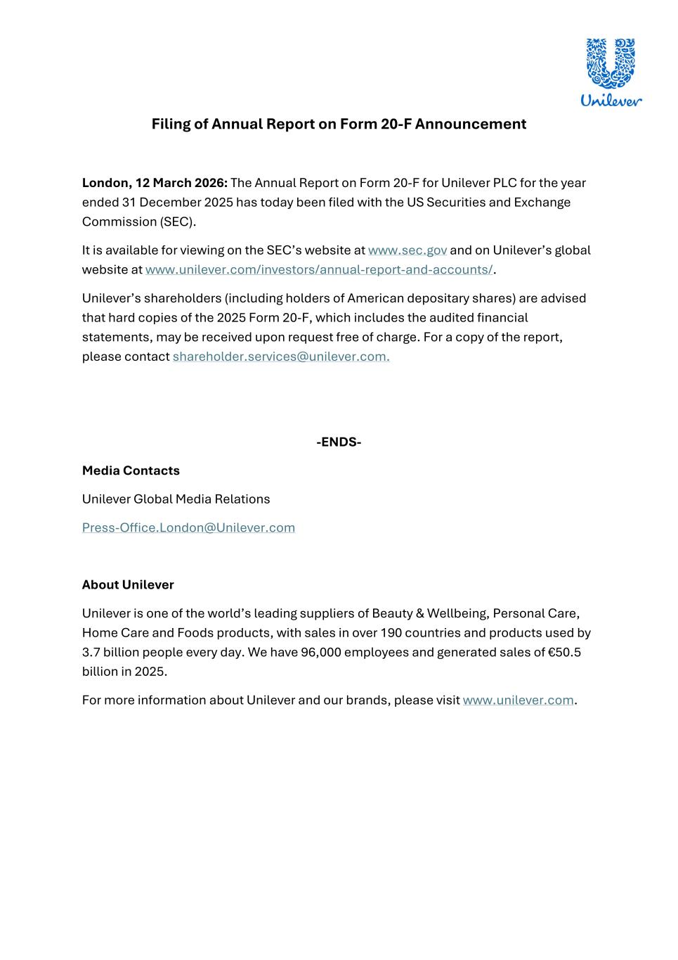 Filing of Annual Report on Form 20-F Announcement London, 12 March 2026: The Annual Report on Form 20-F for Unilever PLC for the year ended 31 December 2025 has today been filed with the US Securities and Exchange Commission (SEC). It is available for viewing on the SEC’s website at www.sec.gov and on Unilever’s global website at www.unilever.com/investors/annual-report-and-accounts/. Unilever’s shareholders (including holders of American depositary shares) are advised that hard copies of the 2025 Form 20-F, which includes the audited financial statements, may be received upon request free of charge. For a copy of the report, please contact shareholder.services@unilever.com. -ENDS- Media Contacts Unilever Global Media Relations Press-Office.London@Unilever.com About Unilever Unilever is one of the world’s leading suppliers of Beauty & Wellbeing, Personal Care, Home Care and Foods products, with sales in over 190 countries and products used by 3.7 billion people every day. We have 96,000 employees and generated sales of €50.5 billion in 2025. For more information about Unilever and our brands, please visit www.unilever.com.