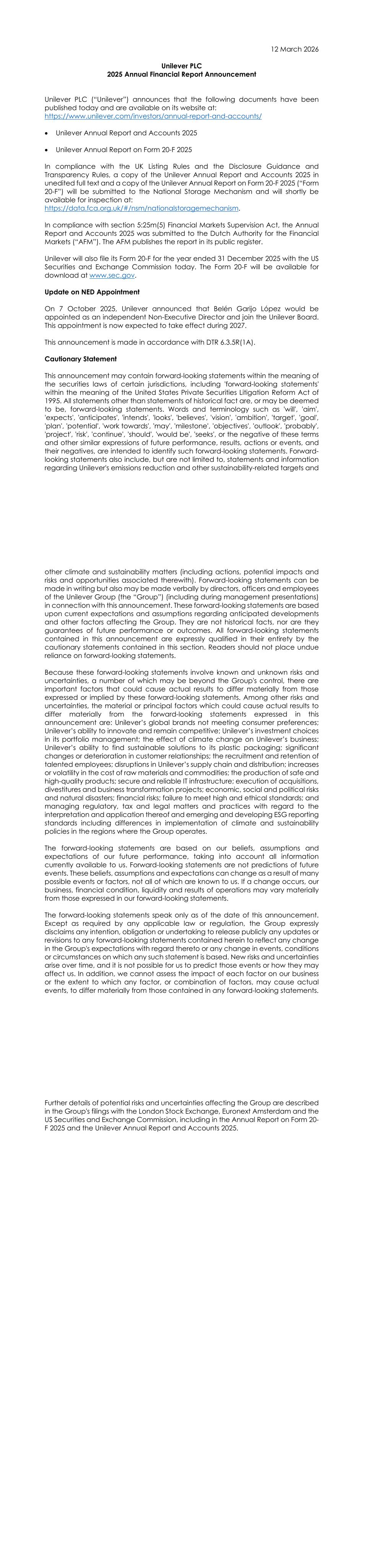 12 March 2026 Unilever PLC 2025 Annual Financial Report Announcement Unilever PLC (“Unilever”) announces that the following documents have been published today and are available on its website at: https://www.unilever.com/investors/annual-report-and-accounts/ • Unilever Annual Report and Accounts 2025 • Unilever Annual Report on Form 20-F 2025 In compliance with the UK Listing Rules and the Disclosure Guidance and Transparency Rules, a copy of the Unilever Annual Report and Accounts 2025 in unedited full text and a copy of the Unilever Annual Report on Form 20-F 2025 (“Form 20-F”) will be submitted to the National Storage Mechanism and will shortly be available for inspection at: https://data.fca.org.uk/#/nsm/nationalstoragemechanism. In compliance with section 5:25m(5) Financial Markets Supervision Act, the Annual Report and Accounts 2025 was submitted to the Dutch Authority for the Financial Markets (“AFM”). The AFM publishes the report in its public register. Unilever will also file its Form 20-F for the year ended 31 December 2025 with the US Securities and Exchange Commission today. The Form 20-F will be available for download at www.sec.gov. Update on NED Appointment On 7 October 2025, Unilever announced that Belén Garijo López would be appointed as an independent Non-Executive Director and join the Unilever Board. This appointment is now expected to take effect during 2027. This announcement is made in accordance with DTR 6.3.5R(1A). Cautionary Statement This announcement may contain forward-looking statements within the meaning of the securities laws of certain jurisdictions, including 'forward-looking statements' within the meaning of the United States Private Securities Litigation Reform Act of 1995. All statements other than statements of historical fact are, or may be deemed to be, forward-looking statements. Words and terminology such as 'will', 'aim', 'expects', 'anticipates', 'intends', 'looks', 'believes', 'vision', 'ambition', 'target', 'goal', 'plan', 'potential', 'work towards', 'may', 'milestone', 'objectives', 'outlook', 'probably', 'project', 'risk', 'continue', 'should', 'would be', 'seeks', or the negative of these terms and other similar expressions of future performance, results, actions or events, and their negatives, are intended to identify such forward-looking statements. Forward- looking statements also include, but are not limited to, statements and information regarding Unilever's emissions reduction and other sustainability-related targets and other climate and sustainability matters (including actions, potential impacts and risks and opportunities associated therewith). Forward-looking statements can be made in writing but also may be made verbally by directors, officers and employees of the Unilever Group (the “Group”) (including during management presentations) in connection with this announcement. These forward-looking statements are based upon current expectations and assumptions regarding anticipated developments and other factors affecting the Group. They are not historical facts, nor are they guarantees of future performance or outcomes. All forward-looking statements contained in this announcement are expressly qualified in their entirety by the cautionary statements contained in this section. Readers should not place undue reliance on forward-looking statements. Because these forward-looking statements involve known and unknown risks and uncertainties, a number of which may be beyond the Group's control, there are important factors that could cause actual results to differ materially from those expressed or implied by these forward-looking statements. Among other risks and uncertainties, the material or principal factors which could cause actual results to differ materially from the forward-looking statements expressed in this announcement are: Unilever’s global brands not meeting consumer preferences; Unilever’s ability to innovate and remain competitive; Unilever’s investment choices in its portfolio management; the effect of climate change on Unilever’s business; Unilever’s ability to find sustainable solutions to its plastic packaging; significant changes or deterioration in customer relationships; the recruitment and retention of talented employees; disruptions in Unilever’s supply chain and distribution; increases or volatility in the cost of raw materials and commodities; the production of safe and high-quality products; secure and reliable IT infrastructure; execution of acquisitions, divestitures and business transformation projects; economic, social and political risks and natural disasters; financial risks; failure to meet high and ethical standards; and managing regulatory, tax and legal matters and practices with regard to the interpretation and application thereof and emerging and developing ESG reporting standards including differences in implementation of climate and sustainability policies in the regions where the Group operates. The forward-looking statements are based on our beliefs, assumptions and expectations of our future performance, taking into account all information currently available to us. Forward-looking statements are not predictions of future events. These beliefs, assumptions and expectations can change as a result of many possible events or factors, not all of which are known to us. If a change occurs, our business, financial condition, liquidity and results of operations may vary materially from those expressed in our forward-looking statements. The forward-looking statements speak only as of the date of this announcement. Except as required by any applicable law or regulation, the Group expressly disclaims any intention, obligation or undertaking to release publicly any updates or revisions to any forward-looking statements contained herein to reflect any change in the Group's expectations with regard thereto or any change in events, conditions or circumstances on which any 