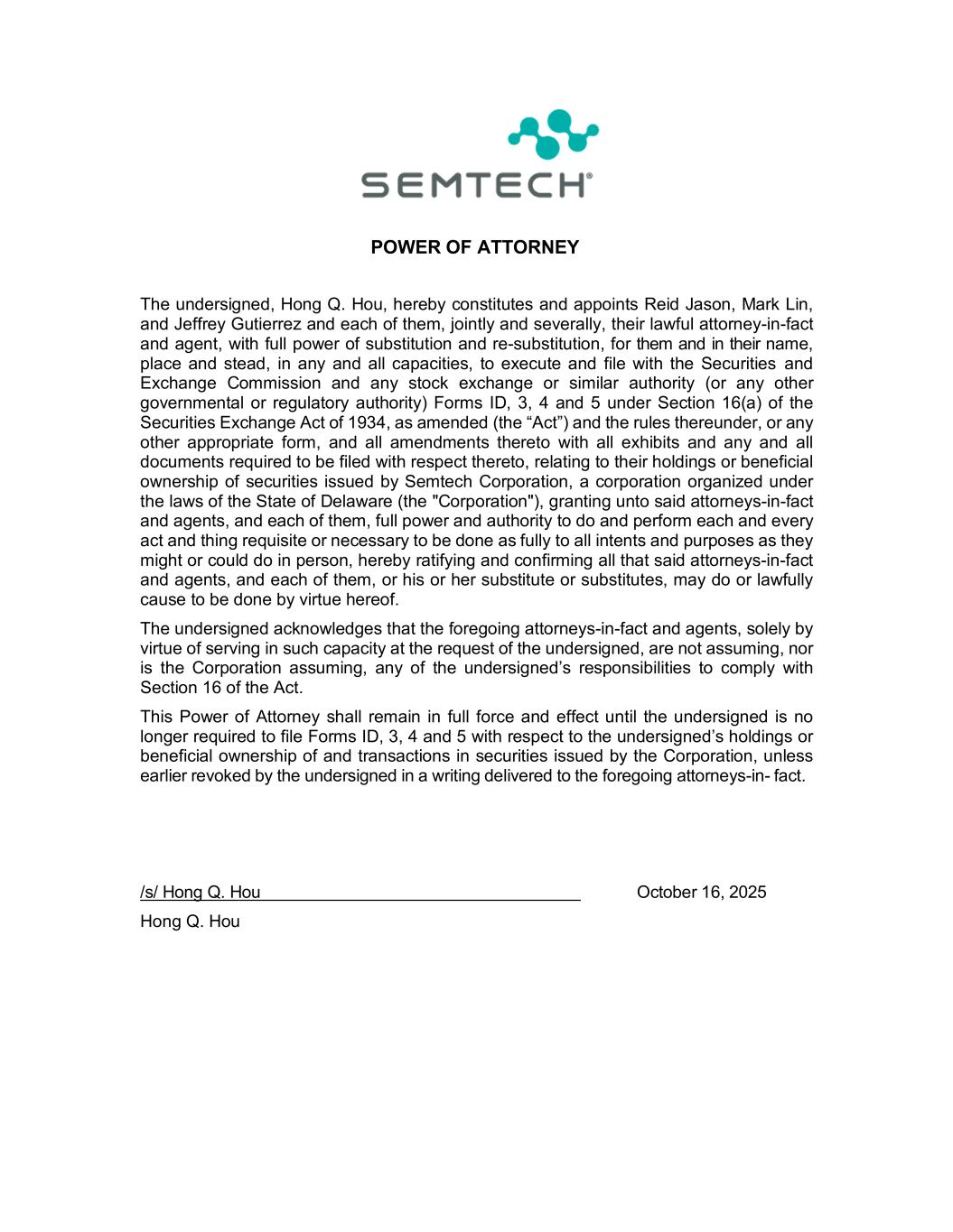 POWER OF ATTORNEY The undersigned, Hong Q. Hou, hereby constitutes and appoints Reid Jason, Mark Lin, and Jeffrey Gutierrez and each of them, jointly and severally, their lawful attorney-in-fact and agent, with full power of substitution and re-substitution, for them and in their name, place and stead, in any and all capacities, to execute and file with the Securities and Exchange Commission and any stock exchange or similar authority (or any other governmental or regulatory authority) Forms ID, 3, 4 and 5 under Section 16(a) of the Securities Exchange Act of 1934, as amended (the “Act”) and the rules thereunder, or any other appropriate form, and all amendments thereto with all exhibits and any and all documents required to be filed with respect thereto, relating to their holdings or beneficial ownership of securities issued by Semtech Corporation, a corporation organized under the laws of the State of Delaware (the "Corporation"), granting unto said attorneys-in-fact and agents, and each of them, full power and authority to do and perform each and every act and thing requisite or necessary to be done as fully to all intents and purposes as they might or could do in person, hereby ratifying and confirming all that said attorneys-in-fact and agents, and each of them, or his or her substitute or substitutes, may do or lawfully cause to be done by virtue hereof. The undersigned acknowledges that the foregoing attorneys-in-fact and agents, solely by virtue of serving in such capacity at the request of the undersigned, are not assuming, nor is the Corporation assuming, any of the undersigned’s responsibilities to comply with Section 16 of the Act. This Power of Attorney shall remain in full force and effect until the undersigned is no longer required to file Forms ID, 3, 4 and 5 with respect to the undersigned’s holdings or beneficial ownership of and transactions in securities issued by the Corporation, unless earlier revoked by the undersigned in a writing delivered to the foregoing attorneys-in- fact. /s/ Hong Q. Hou October 16, 2025 Hong Q. Hou