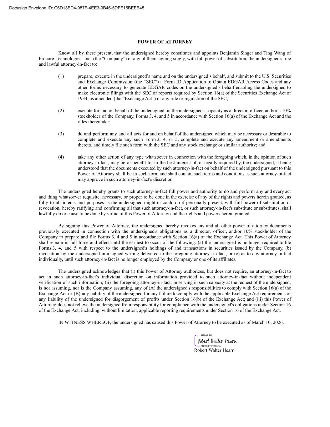 POWER OF ATTORNEY Know all by these present, that the undersigned hereby constitutes and appoints Benjamin Singer and Ting Wang of Procore Technologies, Inc. (the “Company”) or any of them signing singly, with full power of substitution, the undersigned's true and lawful attorney-in-fact to: (1) prepare, execute in the undersigned’s name and on the undersigned’s behalf, and submit to the U.S. Securities and Exchange Commission (the “SEC”) a Form ID Application to Obtain EDGAR Access Codes and any other forms necessary to generate EDGAR codes on the undersigned’s behalf enabling the undersigned to make electronic filings with the SEC of reports required by Section 16(a) of the Securities Exchange Act of 1934, as amended (the “Exchange Act”) or any rule or regulation of the SEC; (2) execute for and on behalf of the undersigned, in the undersigned's capacity as a director, officer, and/or a 10% stockholder of the Company, Forms 3, 4, and 5 in accordance with Section 16(a) of the Exchange Act and the rules thereunder; (3) do and perform any and all acts for and on behalf of the undersigned which may be necessary or desirable to complete and execute any such Form 3, 4, or 5, complete and execute any amendment or amendments thereto, and timely file such form with the SEC and any stock exchange or similar authority; and (4) take any other action of any type whatsoever in connection with the foregoing which, in the opinion of such attorney-in-fact, may be of benefit to, in the best interest of, or legally required by, the undersigned, it being understood that the documents executed by such attorney-in-fact on behalf of the undersigned pursuant to this Power of Attorney shall be in such form and shall contain such terms and conditions as such attorney-in-fact may approve in such attorney-in-fact's discretion. The undersigned hereby grants to such attorney-in-fact full power and authority to do and perform any and every act and thing whatsoever requisite, necessary, or proper to be done in the exercise of any of the rights and powers herein granted, as fully to all intents and purposes as the undersigned might or could do if personally present, with full power of substitution or revocation, hereby ratifying and confirming all that such attorney-in-fact, or such attorney-in-fact's substitute or substitutes, shall lawfully do or cause to be done by virtue of this Power of Attorney and the rights and powers herein granted. By signing this Power of Attorney, the undersigned hereby revokes any and all other power of attorney documents previously executed in connection with the undersigned's obligations as a director, officer, and/or 10% stockholder of the Company to prepare and file Forms 3, 4 and 5 in accordance with Section 16(a) of the Exchange Act. This Power of Attorney shall remain in full force and effect until the earliest to occur of the following: (a) the undersigned is no longer required to file Forms 3, 4, and 5 with respect to the undersigned's holdings of and transactions in securities issued by the Company, (b) revocation by the undersigned in a signed writing delivered to the foregoing attorneys-in-fact, or (c) as to any attorney-in-fact individually, until such attorney-in-fact is no longer employed by the Company or one of its affiliates. The undersigned acknowledges that (i) this Power of Attorney authorizes, but does not require, an attorney-in-fact to act in such attorney-in-fact’s individual discretion on information provided to such attorney-in-fact without independent verification of such information; (ii) the foregoing attorney-in-fact, in serving in such capacity at the request of the undersigned, is not assuming, nor is the Company assuming, any of (A) the undersigned's responsibilities to comply with Section 16(a) of the Exchange Act or (B) any liability of the undersigned for any failure to comply with the applicable Exchange Act requirements or any liability of the undersigned for disgorgement of profits under Section 16(b) of the Exchange Act; and (iii) this Power of Attorney does not relieve the undersigned from responsibility for compliance with the undersigned's obligations under Section 16 of the Exchange Act, including, without limitation, applicable reporting requirements under Section 16 of the Exchange Act. IN WITNESS WHEREOF, the undersigned has caused this Power of Attorney to be executed as of March 10, 2026. ____________________ Robert Walter Hearn Docusign Envelope ID: C6D13BD4-087F-4EE3-9B46-5DFE15BEEB45