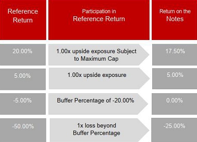 | The table at right shows the hypothetical payout profile of an investment in the Notes, reflecting the Maximum Cap of 17.50% reflecting the Upside Participation Rate of 100.00% (1.00x), and reflecting the Buffer Percentage of -25.00%. |