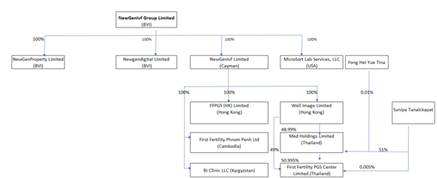 With a focus on providing fertility treatments to fulfil the dreams of building families, NewGenIvf mainly offers two services, namely: (i) in vitro fertilization (“IVF”) treatment service, comprising traditional IVF and egg donation; and (ii) surrogacy and ancillary caring services. Currently, we have four clinics: two clinics in Thailand (one of which, whilst licensed, is yet to commence operations), one clinic in Cambodia, and one clinic in Kyrgyzstan.