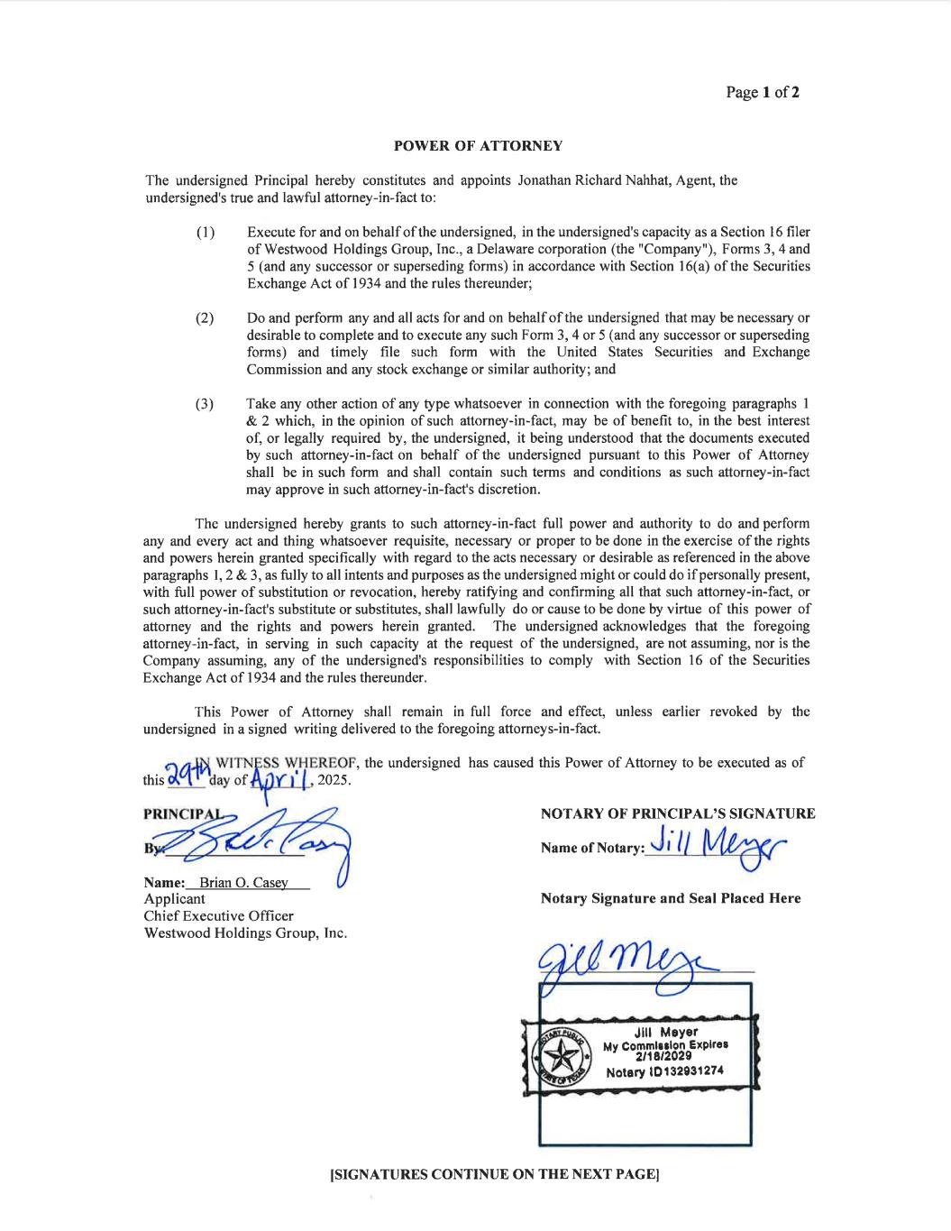 Page 1 of2 POWER OF ATTORNEY The undersigned Principal hereby constitutes and appoints Jonathan Richard Nahhat, Agent, the undersigned's true and lawful attorney-in-fact to: ( I ) Execute for and on behalf ofthe undersigned, in the undersigned's capacity as a Section I 6 filer of Westwood Holdings Group, Inc., a Delaware corporation (the "Company"), Forms 3, 4 and 5 (and any sucçessor or superseding forms) in accordance with Section 16(a) ofthe Securities Exchange Act of 1934 and the rules thereunder; (2) Do and perform any and all acts for and on behalfofthe undersigned that may be necessary or desirable to complete and to execute any such Form 3, 4 or 5 (and any successor or superseding forms) and timely file such form with the United States Securities and Exchange Commission and any stock exchange or similar authority; and (3) Take any other action ofany type whatsoever in connection with the foregoing paragraphs I &2 which, intheopinion of such attorney-in-fact,may be of benefit to, inthe best interest of, or legally required by, the undersigned, it being understood that the documents executed by such attorney-in-fact on behalf of the undersigned pursuant to this Power of Attomey shall be in such form and shall contain such terms and conditions as such attorney-in-fact may approve in such attorney-in-fact's discretion. The undersigned hereby grants to such attorney-in-fact full power and authority to do and perform any and every act and thing whatsoever requisite, necessary or proper to be done in the exercise ofthe rights and powers herein granted specifically with regard to the acts necessary or desirable as referenced in the above paragraphs 1,2 &.3, as fully to all intents and purposes as the undersigned might or could do if personally present, with full power of substitution or revocation, hereby ratiffing and conf,irming all that such attorney-in-fact, or such attorney-in-façt's substitute or substitutes, shall lawfully do or cause to be done by virtue of this power of attorney and the rights and powers herein granted. The undersigned acknowledges that the foregoing attorney-in-fact, in serving in such capacity at the request of the undersigned, are not assuming, nor is the Company assuming, any of the undersigned's responsibilities to comply with Section 16 of the Securities Exchange Act of 1 934 and the rules thereunder. This Power of Attorney shall remain in full force and effect, unless earlier revoked by the undersigned in a signed writing delivered to the foregoing attorneys-in-fact. , the undersigned has caused this Power ofAttorney to be executed as of this of 202s. NOTARY OF PRINCIPAL'S SIGNATURE Name orNora "r, J; I I lL/ryf Notary Signature and Seal Placed Here Name: Brian O. Casey Applicant Chief Executive Officer Westwood Holdings Group, Inc. Jill MeYer ur ""äTåii,EâeExPIroN Notåry |D13293f 274 ISIGNATURES CONTINUE ON THE NEXT PAGEì