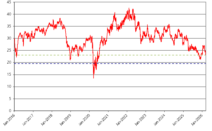 The graph below illustrates the performance of the underlying asset from January 1, 2016 through March 12, 2026, based on the daily closing levels as reported by Bloomberg, without independent verification. BNS has not conducted any independent review or due diligence of any publicly available information obtained from Bloomberg. The closing level of the underlying asset on March 12, 2026 was $23.03. The dotted lines respectively represent the call threshold level of $23.03, which is equal to 100.00% of the initial level, and the conversion level of $19.58, which is equal to 85.00% of the initial level. Past performance of the underlying asset is not indicative of the future performance of the underlying asset during the term of the Notes.