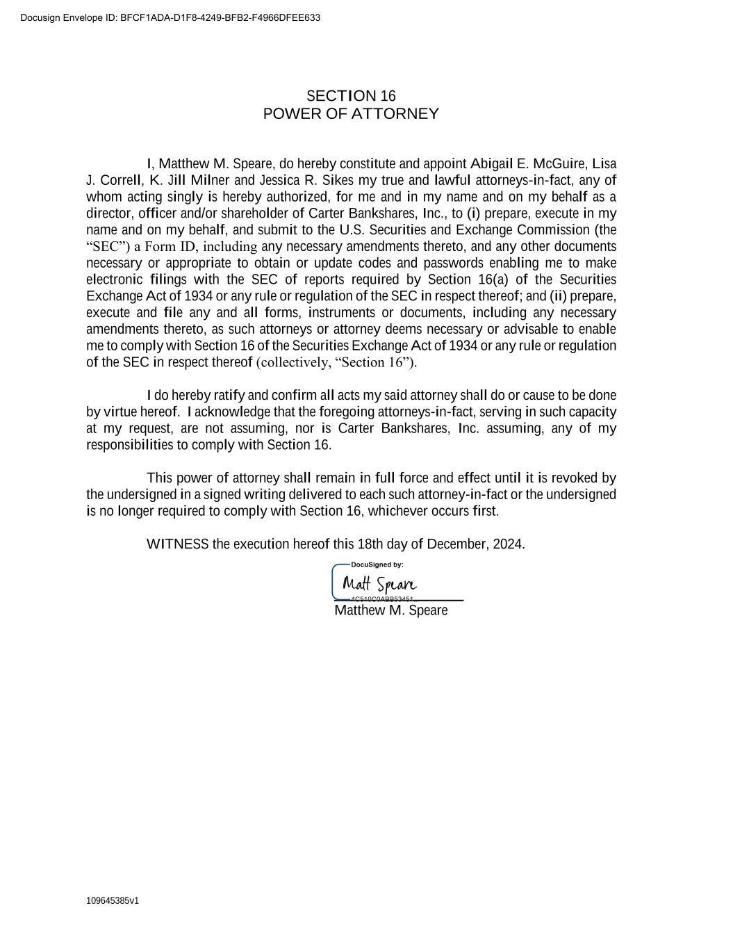 109645385v1 SECTION 16 POWER OF ATTORNEY I, Matthew M. Speare, do hereby constitute and appoint Abigail E. McGuire, Lisa J. Correll, K. Jill Milner and Jessica R. Sikes my true and lawful attorneys-in-fact, any of whom acting singly is hereby authorized, for me and in my name and on my behalf as a director, officer and/or shareholder of Carter Bankshares, Inc., to (i) prepare, execute in my name and on my behalf, and submit to the U.S. Securities and Exchange Commission (the “SEC”) a Form ID, including any necessary amendments thereto, and any other documents necessary or appropriate to obtain or update codes and passwords enabling me to make electronic filings with the SEC of reports required by Section 16(a) of the Securities Exchange Act of 1934 or any rule or regulation of the SEC in respect thereof; and (ii) prepare, execute and file any and all forms, instruments or documents, including any necessary amendments thereto, as such attorneys or attorney deems necessary or advisable to enable me to comply with Section 16 of the Securities Exchange Act of 1934 or any rule or regulation of the SEC in respect thereof (collectively, “Section 16”). I do hereby ratify and confirm all acts my said attorney shall do or cause to be done by virtue hereof. I acknowledge that the foregoing attorneys-in-fact, serving in such capacity at my request, are not assuming, nor is Carter Bankshares, Inc. assuming, any of my responsibilities to comply with Section 16. This power of attorney shall remain in full force and effect until it is revoked by the undersigned in a signed writing delivered to each such attorney-in-fact or the undersigned is no longer required to comply with Section 16, whichever occurs first. WITNESS the execution hereof this 18th day of December, 2024. __________________ Matthew M. Speare Docusign Envelope ID: BFCF1ADA-D1F8-4249-BFB2-F4966DFEE633