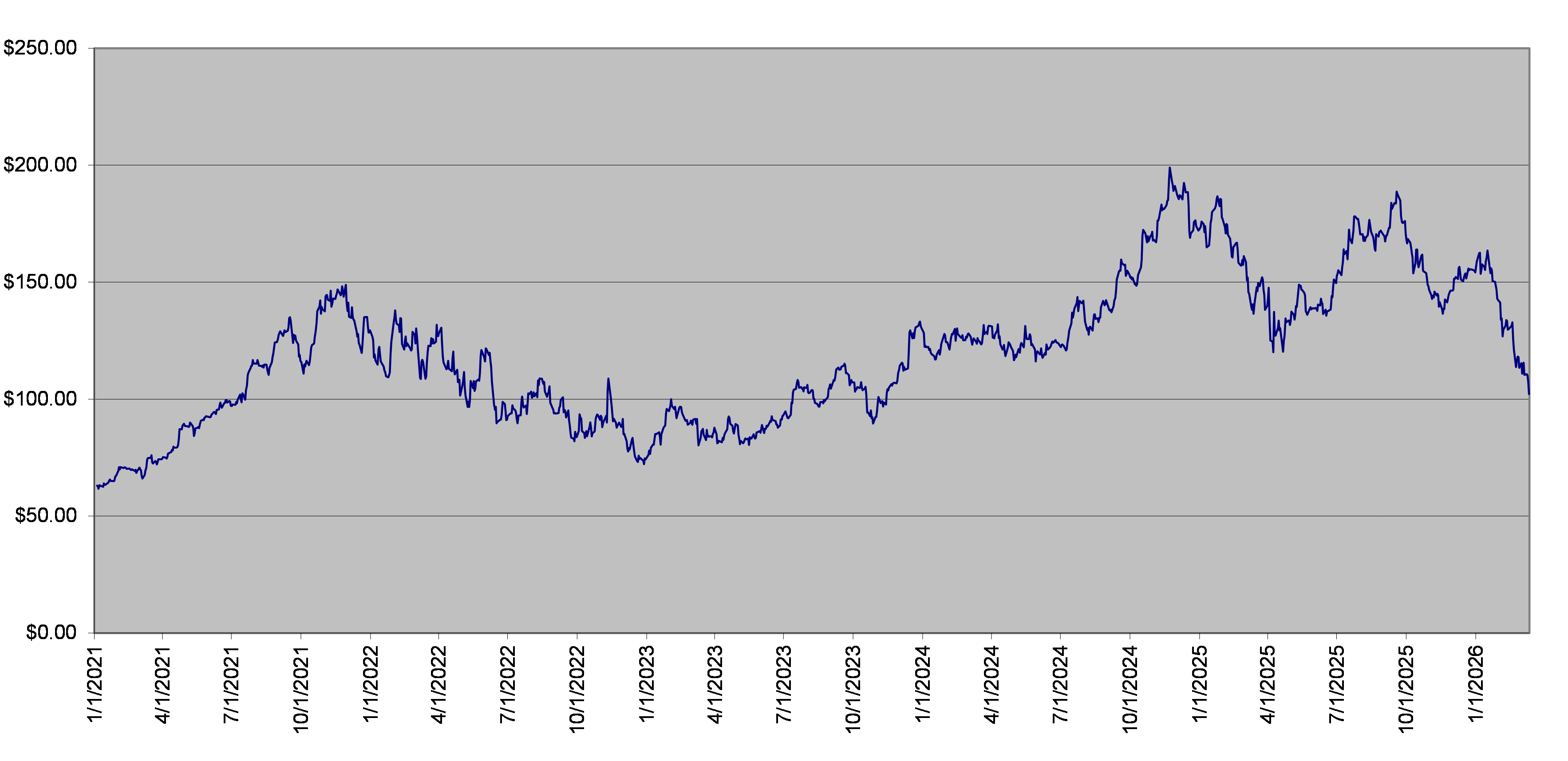 The closing level of the underlier on March 12, 2026 was $102.12. The following graph sets forth the daily closing levels of the underlier for the period noted below. We obtained the historical information presented in this document from Bloomberg Financial Markets, without independent verification. The underlier has at times experienced periods of high volatility. You should not take the historical closing levels of the underlier as an indication of its future performance, and no assurance can be given as to the closing level of the underlier at any time.