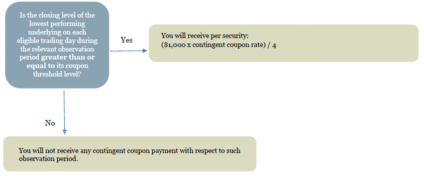 With respect to each observation period, you will receive a contingent coupon payment on the contingent coupon payment date immediately following such observation period at a per annum rate equal to the contingent coupon rate if, and only if, the closing level of the lowest performing underlying on each eligible trading day during such observation period is greater than or equal to its coupon threshold level. Each “contingent coupon payment”, if any, will be calculated per security as follows: ($1,000 × contingent coupon rate) / 4. Any contingent coupon payment will be rounded to the nearest cent, with one-half cent rounded upward. If the closing level of the lowest performing underlying on any eligible trading day during an observation period is less than its coupon threshold level, you will not receive a contingent coupon payment on the related contingent coupon payment date. If the closing level of at least one underlying is less than its coupon threshold level on one or more eligible trading days during each observation period, you will not receive any contingent coupons throughout the entire term of the securities. |