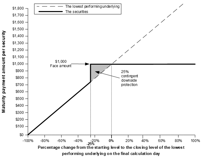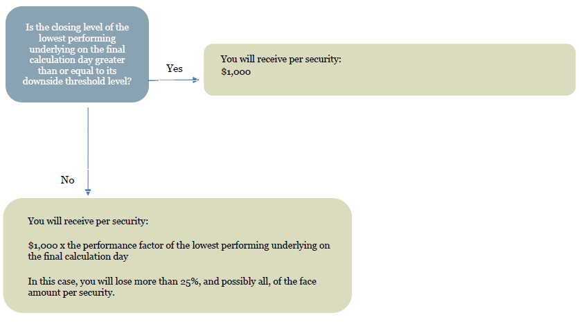 If the securities are not automatically called, you will be entitled to receive on the maturity date a cash payment per security equal to the maturity payment amount (in addition to the final contingent coupon payment, if payable). The “maturity payment amount” per security will equal: ●if the closing level of each underlying on the final calculation day is greater than or equal to its downside threshold level: $1,000; or ●if the closing level of any underlying on the final calculation day is less than its downside threshold level: $1,000 × performance factor of the lowest performing underlying on the final calculation day Under these circumstances, you will lose more than 25%, and possibly all, of your investment. |