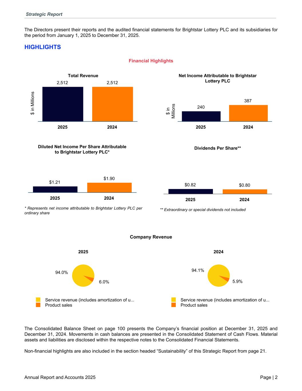 The Directors present their reports and the audited financial statements for Brightstar Lottery PLC and its subsidiaries for the period from January 1, 2025 to December 31, 2025. HIGHLIGHTS Financial Highlights $ in M illi on s Total Revenue 2,512 2,512 2025 2024 Diluted Net Income Per Share Attributable to Brightstar Lottery PLC* $1.21 $1.90 2025 2024 * Represents net income attributable to Brightstar Lottery PLC per ordinary share $ in M illi on s Net Income Attributable to Brightstar Lottery PLC 240 387 2025 2024 Dividends Per Share** $0.82 $0.80 2025 2024 ** Extraordinary or special dividends not included Company Revenue 2025 94.0% 6.0% Service revenue (includes amortization of u... Product sales 2024 94.1% 5.9% Service revenue (includes amortization of u... Product sales The Consolidated Balance Sheet on page 100 presents the Company’s financial position at December 31, 2025 and December 31, 2024. Movements in cash balances are presented in the Consolidated Statement of Cash Flows. Material assets and liabilities are disclosed within the respective notes to the Consolidated Financial Statements. Non-financial highlights are also included in the section headed “Sustainability” of this Strategic Report from page 21. Strategic Report Annual Report and Accounts 2025 Page | 2