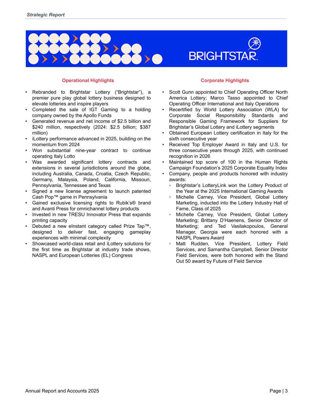 Operational Highlights • Rebranded to Brightstar Lottery (“Brightstar”), a premier pure play global lottery business designed to elevate lotteries and inspire players • Completed the sale of IGT Gaming to a holding company owned by the Apollo Funds • Generated revenue and net income of $2.5 billion and $240 million, respectively (2024: $2.5 billion; $387 million) • iLottery performance advanced in 2025, building on the momentum from 2024 • Won substantial nine-year contract to continue operating Italy Lotto • Was awarded significant lottery contracts and extensions in several jurisdictions around the globe, including Australia, Canada, Croatia, Czech Republic, Germany, Malaysia, Poland, California, Missouri, Pennsylvania, Tennessee and Texas • Signed a new license agreement to launch patented Cash Pop™ game in Pennsylvania • Gained exclusive licensing rights to Rubik’s® brand and Avanti Press for omnichannel lottery products • Invested in new TRESU Innovator Press that expands printing capacity • Debuted a new eInstant category called Prize Tap™, designed to deliver fast, engaging gameplay experiences with minimal complexity • Showcased world-class retail and iLottery solutions for the first time as Brightstar at industry trade shows, NASPL and European Lotteries (EL) Congress Corporate Highlights • Scott Gunn appointed to Chief Operating Officer North America Lottery; Marco Tasso appointed to Chief Operating Officer International and Italy Operations • Recertified by World Lottery Association (WLA) for Corporate Social Responsibility Standards and Responsible Gaming Framework for Suppliers for Brightstar’s Global Lottery and iLottery segments • Obtained European Lottery certification in Italy for the sixth consecutive year • Received Top Employer Award in Italy and U.S. for three consecutive years through 2025, with continued recognition in 2026 • Maintained top score of 100 in the Human Rights Campaign Foundation’s 2025 Corporate Equality Index • Company, people and products honored with industry awards: ◦ Brightstar’s LotteryLink won the Lottery Product of the Year at the 2025 International Gaming Awards ◦ Michelle Carney, Vice President, Global Lottery Marketing, inducted into the Lottery Industry Hall of Fame, Class of 2025 ◦ Michelle Carney, Vice President, Global Lottery Marketing; Brittany D’Haenens, Senior Director of Marketing; and Ted Vasilakopoulos, General Manager, Georgia were each honored with a NASPL Powers Award ◦ Matt Rudden, Vice President, Lottery Field Services, and Samantha Campbell, Senior Director Field Services, were both honored with the Stand Out 50 award by Future of Field Service Strategic Report Annual Report and Accounts 2025 Page | 3