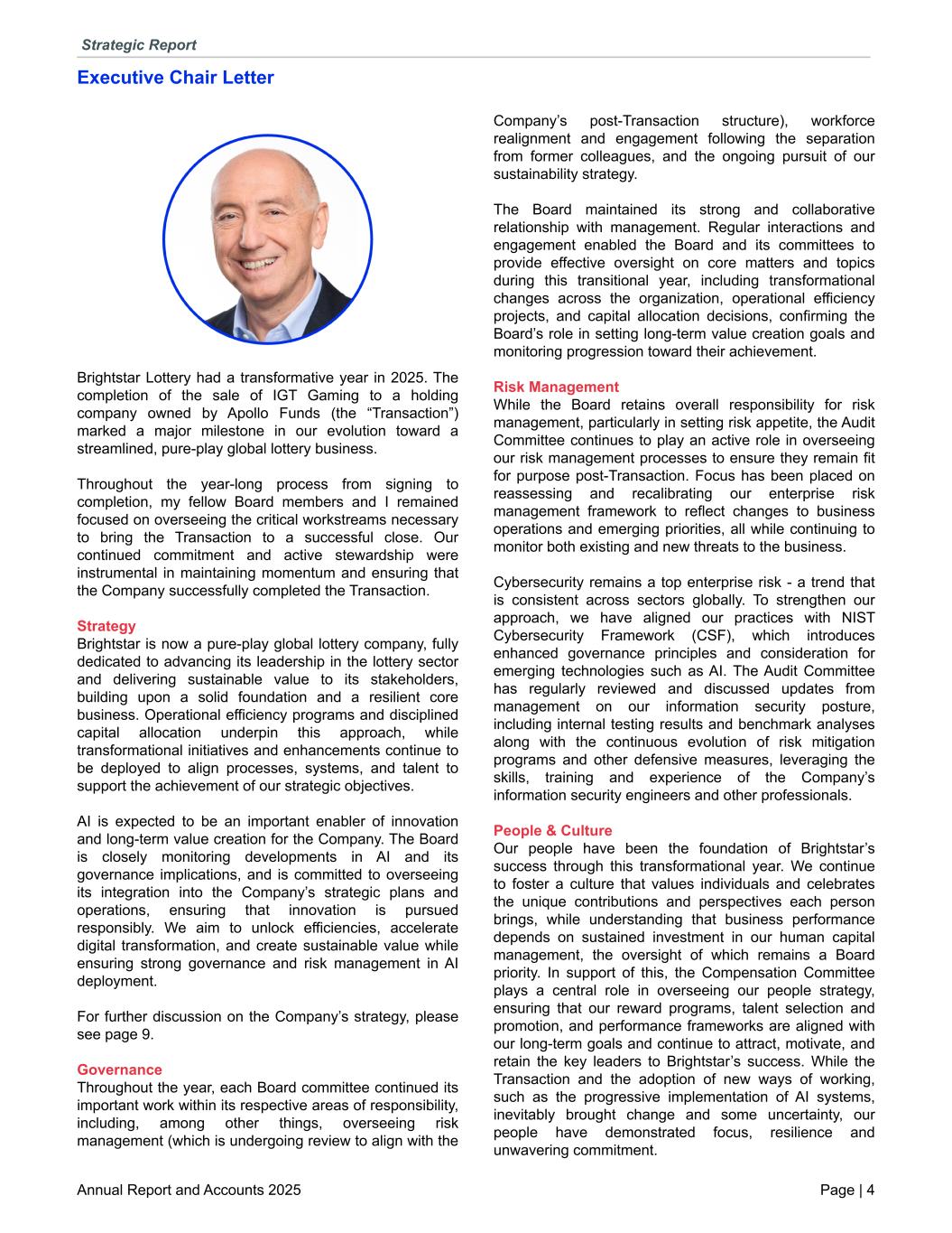 Executive Chair Letter Brightstar Lottery had a transformative year in 2025. The completion of the sale of IGT Gaming to a holding company owned by Apollo Funds (the “Transaction”) marked a major milestone in our evolution toward a streamlined, pure-play global lottery business. Throughout the year-long process from signing to completion, my fellow Board members and I remained focused on overseeing the critical workstreams necessary to bring the Transaction to a successful close. Our continued commitment and active stewardship were instrumental in maintaining momentum and ensuring that the Company successfully completed the Transaction. Strategy Brightstar is now a pure-play global lottery company, fully dedicated to advancing its leadership in the lottery sector and delivering sustainable value to its stakeholders, building upon a solid foundation and a resilient core business. Operational efficiency programs and disciplined capital allocation underpin this approach, while transformational initiatives and enhancements continue to be deployed to align processes, systems, and talent to support the achievement of our strategic objectives. AI is expected to be an important enabler of innovation and long-term value creation for the Company. The Board is closely monitoring developments in AI and its governance implications, and is committed to overseeing its integration into the Company’s strategic plans and operations, ensuring that innovation is pursued responsibly. We aim to unlock efficiencies, accelerate digital transformation, and create sustainable value while ensuring strong governance and risk management in AI deployment. For further discussion on the Company’s strategy, please see page 9. Governance Throughout the year, each Board committee continued its important work within its respective areas of responsibility, including, among other things, overseeing risk management (which is undergoing review to align with the Company’s post-Transaction structure), workforce realignment and engagement following the separation from former colleagues, and the ongoing pursuit of our sustainability strategy. The Board maintained its strong and collaborative relationship with management. Regular interactions and engagement enabled the Board and its committees to provide effective oversight on core matters and topics during this transitional year, including transformational changes across the organization, operational efficiency projects, and capital allocation decisions, confirming the Board’s role in setting long-term value creation goals and monitoring progression toward their achievement. Risk Management While the Board retains overall responsibility for risk management, particularly in setting risk appetite, the Audit Committee continues to play an active role in overseeing our risk management processes to ensure they remain fit for purpose post-Transaction. Focus has been placed on reassessing and recalibrating our enterprise risk management framework to reflect changes to business operations and emerging priorities, all while continuing to monitor both existing and new threats to the business. Cybersecurity remains a top enterprise risk - a trend that is consistent across sectors globally. To strengthen our approach, we have aligned our practices with NIST Cybersecurity Framework (CSF), which introduces enhanced governance principles and consideration for emerging technologies such as AI. The Audit Committee has regularly reviewed and discussed updates from management on our information security posture, including internal testing results and benchmark analyses along with the continuous evolution of risk mitigation programs and other defensive measures, leveraging the skills, training and experience of the Company’s information security engineers and other professionals. People & Culture Our people have been the foundation of Brightstar’s success through this transformational year. We continue to foster a culture that values individuals and celebrates the unique contributions and perspectives each person brings, while understanding that business performance depends on sustained investment in our human capital management, the oversight of which remains a Board priority. In support of this, the Compensation Committee plays a central role in overseeing our people strategy, ensuring that our reward programs, talent selection and promotion, and performance frameworks are aligned with our long-term goals and continue to attract, motivate, and retain the key leaders to Brightstar’s success. While the Transaction and the adoption of new ways of working, such as the progressive implementation of AI systems, inevitably brought change and some uncertainty, our people have demonstrated focus, resilience and unwavering commitment. Strategic Report Annual Report and Accounts 2025 Page | 4