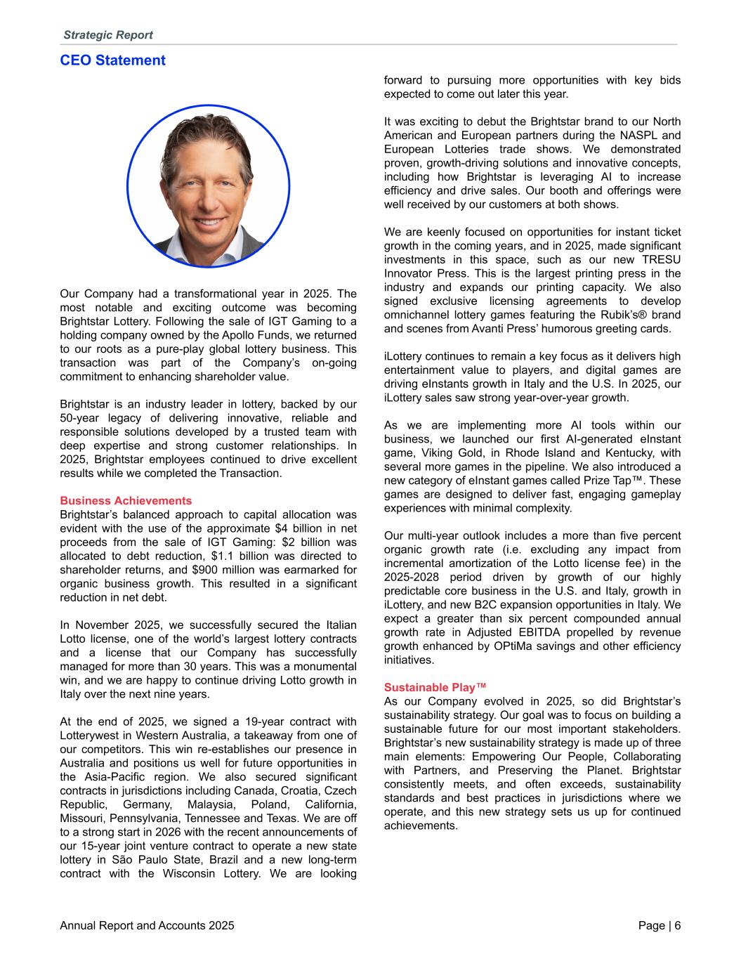 CEO Statement Our Company had a transformational year in 2025. The most notable and exciting outcome was becoming Brightstar Lottery. Following the sale of IGT Gaming to a holding company owned by the Apollo Funds, we returned to our roots as a pure-play global lottery business. This transaction was part of the Company’s on-going commitment to enhancing shareholder value. Brightstar is an industry leader in lottery, backed by our 50-year legacy of delivering innovative, reliable and responsible solutions developed by a trusted team with deep expertise and strong customer relationships. In 2025, Brightstar employees continued to drive excellent results while we completed the Transaction. Business Achievements Brightstar’s balanced approach to capital allocation was evident with the use of the approximate $4 billion in net proceeds from the sale of IGT Gaming: $2 billion was allocated to debt reduction, $1.1 billion was directed to shareholder returns, and $900 million was earmarked for organic business growth. This resulted in a significant reduction in net debt. In November 2025, we successfully secured the Italian Lotto license, one of the world’s largest lottery contracts and a license that our Company has successfully managed for more than 30 years. This was a monumental win, and we are happy to continue driving Lotto growth in Italy over the next nine years. At the end of 2025, we signed a 19-year contract with Lotterywest in Western Australia, a takeaway from one of our competitors. This win re-establishes our presence in Australia and positions us well for future opportunities in the Asia-Pacific region. We also secured significant contracts in jurisdictions including Canada, Croatia, Czech Republic, Germany, Malaysia, Poland, California, Missouri, Pennsylvania, Tennessee and Texas. We are off to a strong start in 2026 with the recent announcements of our 15-year joint venture contract to operate a new state lottery in São Paulo State, Brazil and a new long-term contract with the Wisconsin Lottery. We are looking forward to pursuing more opportunities with key bids expected to come out later this year. It was exciting to debut the Brightstar brand to our North American and European partners during the NASPL and European Lotteries trade shows. We demonstrated proven, growth-driving solutions and innovative concepts, including how Brightstar is leveraging AI to increase efficiency and drive sales. Our booth and offerings were well received by our customers at both shows. We are keenly focused on opportunities for instant ticket growth in the coming years, and in 2025, made significant investments in this space, such as our new TRESU Innovator Press. This is the largest printing press in the industry and expands our printing capacity. We also signed exclusive licensing agreements to develop omnichannel lottery games featuring the Rubik’s® brand and scenes from Avanti Press’ humorous greeting cards. iLottery continues to remain a key focus as it delivers high entertainment value to players, and digital games are driving eInstants growth in Italy and the U.S. In 2025, our iLottery sales saw strong year-over-year growth. As we are implementing more AI tools within our business, we launched our first AI-generated eInstant game, Viking Gold, in Rhode Island and Kentucky, with several more games in the pipeline. We also introduced a new category of eInstant games called Prize Tap™. These games are designed to deliver fast, engaging gameplay experiences with minimal complexity. Our multi-year outlook includes a more than five percent organic growth rate (i.e. excluding any impact from incremental amortization of the Lotto license fee) in the 2025-2028 period driven by growth of our highly predictable core business in the U.S. and Italy, growth in iLottery, and new B2C expansion opportunities in Italy. We expect a greater than six percent compounded annual growth rate in Adjusted EBITDA propelled by revenue growth enhanced by OPtiMa savings and other efficiency initiatives. Sustainable Play™ As our Company evolved in 2025, so did Brightstar’s sustainability strategy. Our goal was to focus on building a sustainable future for our most important stakeholders. Brightstar’s new sustainability strategy is made up of three main elements: Empowering Our People, Collaborating with Partners, and Preserving the Planet. Brightstar consistently meets, and often exceeds, sustainability standards and best practices in jurisdictions where we operate, and this new strategy sets us up for continued achievements. Strategic Report Annual Report and Accounts 2025 Page | 6