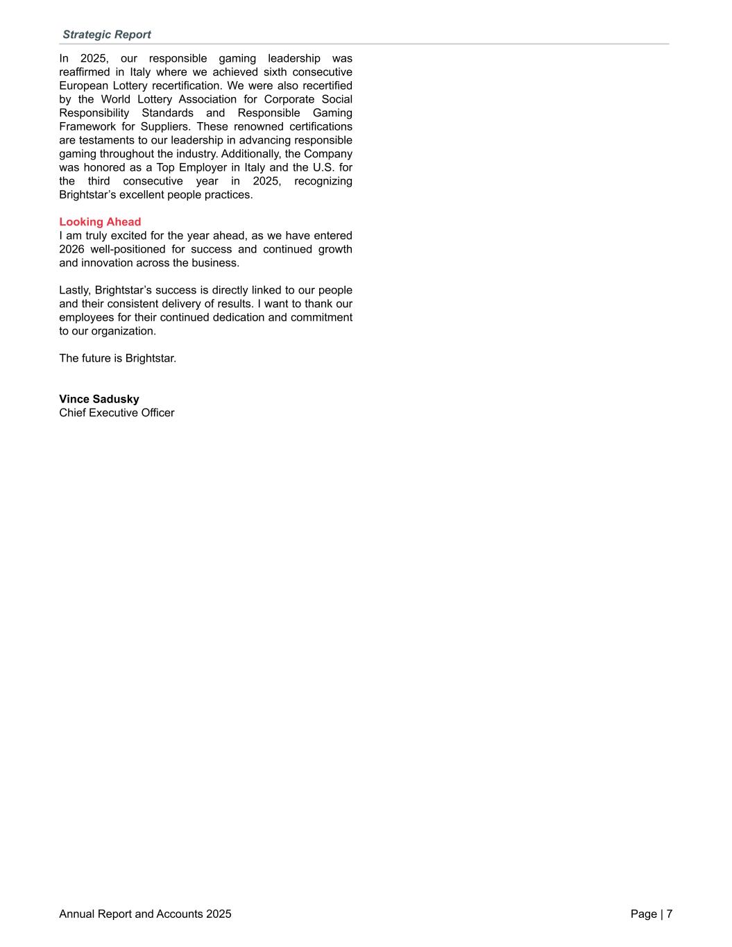 In 2025, our responsible gaming leadership was reaffirmed in Italy where we achieved sixth consecutive European Lottery recertification. We were also recertified by the World Lottery Association for Corporate Social Responsibility Standards and Responsible Gaming Framework for Suppliers. These renowned certifications are testaments to our leadership in advancing responsible gaming throughout the industry. Additionally, the Company was honored as a Top Employer in Italy and the U.S. for the third consecutive year in 2025, recognizing Brightstar’s excellent people practices. Looking Ahead I am truly excited for the year ahead, as we have entered 2026 well-positioned for success and continued growth and innovation across the business. Lastly, Brightstar’s success is directly linked to our people and their consistent delivery of results. I want to thank our employees for their continued dedication and commitment to our organization. The future is Brightstar. Vince Sadusky Chief Executive Officer Strategic Report Annual Report and Accounts 2025 Page | 7